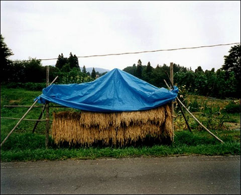 On retrouve partout cette bâche dans la civilisation nipponne contemporaine. L’homme sans domicile s’en sert pour se faire un abri, le paysan pour protéger le fruit de son travail. Dans le bâtiment la feuille bleue est l’accessoire indispensable pour mettre à l’abri de l’eau les toitures éventrées ou les travaux en cours. Un jour de pique-nique elle sera étendue sur le sol en guise de nappe, sur la plage elle devient natte ou drap de bain, elle servira de tapis de prière au cadre pendant sa pause. L’impact sur le paysage semble permanent et non négligeable, même par temps de neige sous le manteau blanc, la feuille bleue n’est pas discrète.