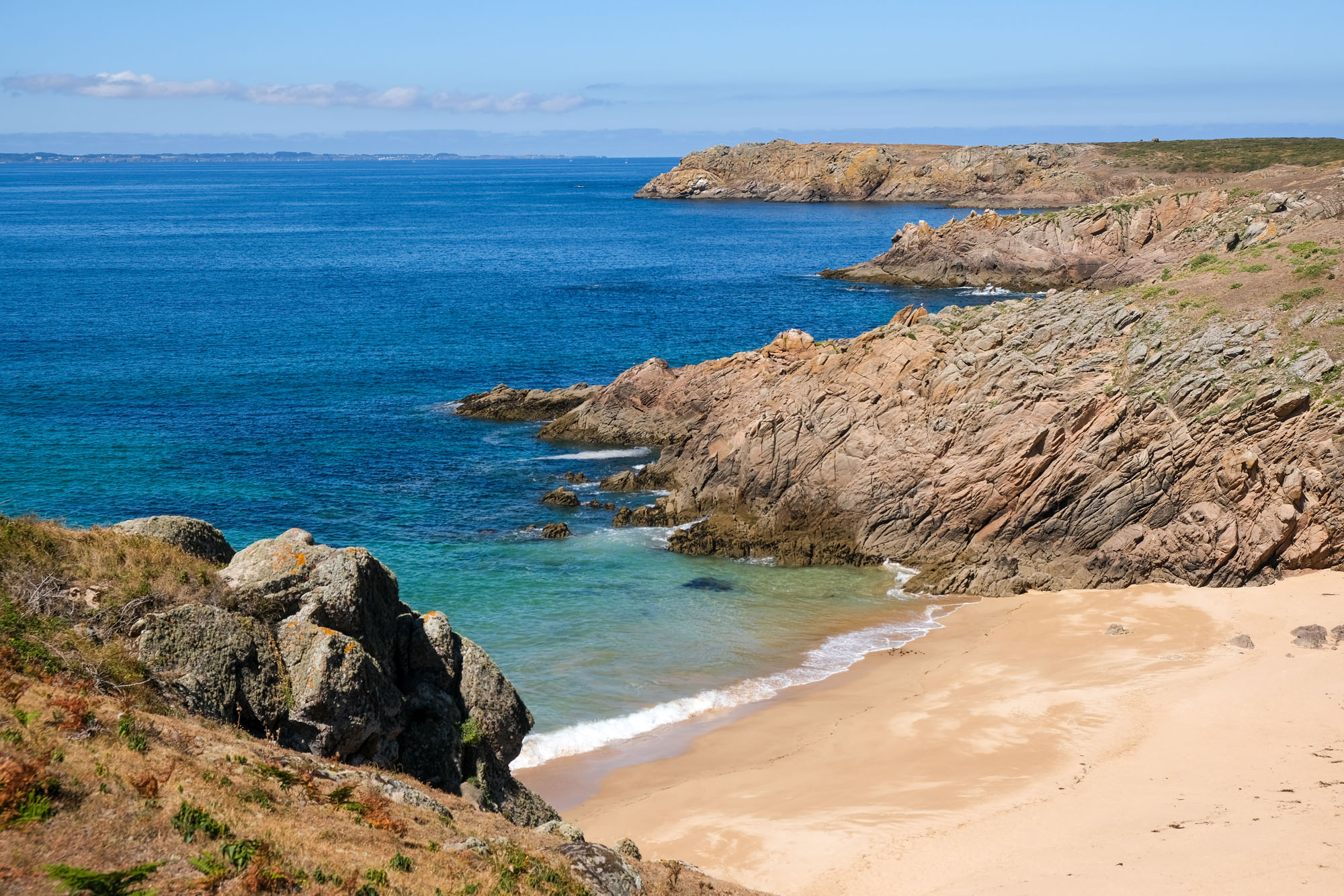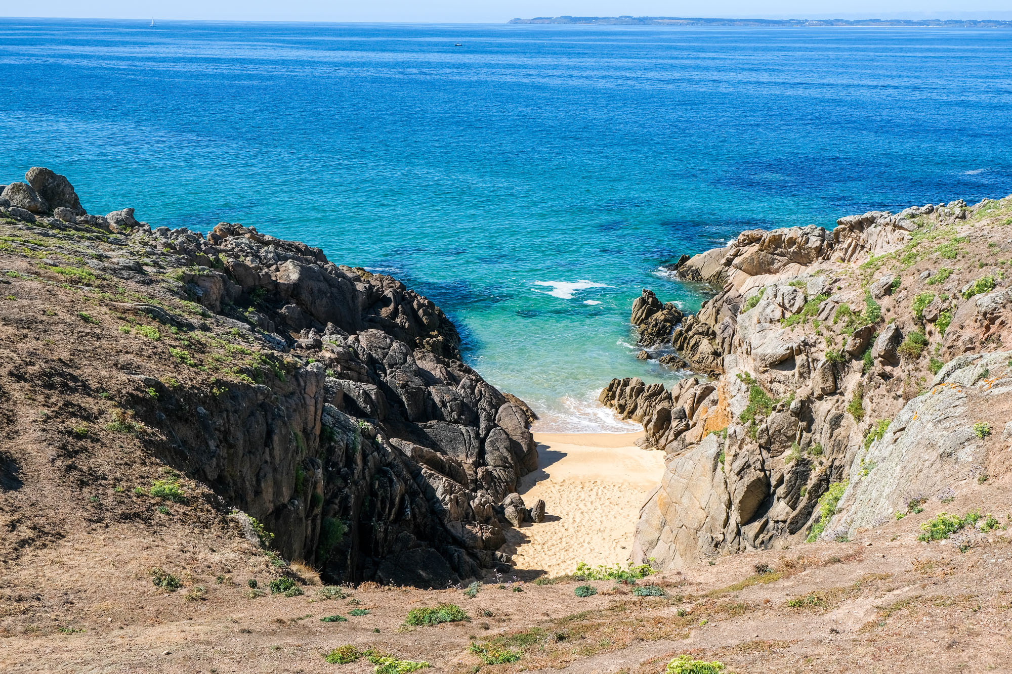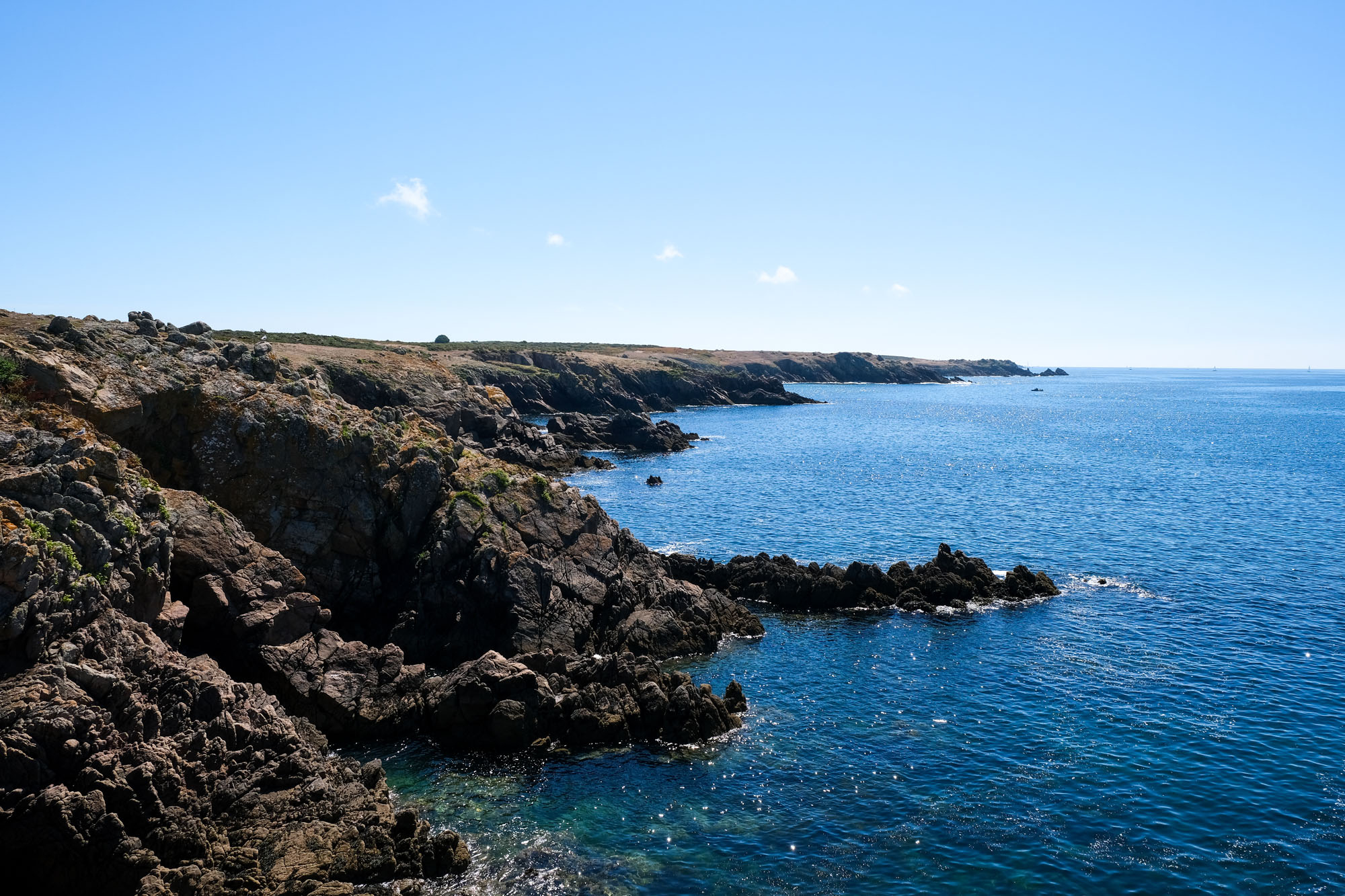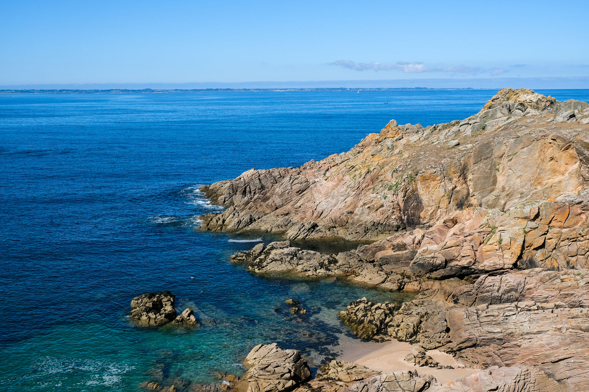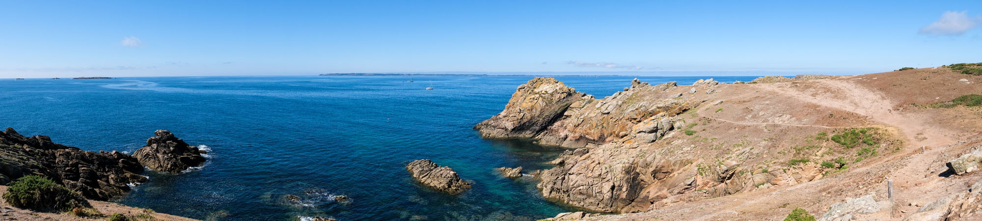 – les deux tiers ouest, qui sont un ultime vestige perdu en mer des crêtes autrefois élevées du Massif armoricain. La côte y est particulièrement déchirée, en particulier au Sud, résultat des assauts perpétuels de l’océan.