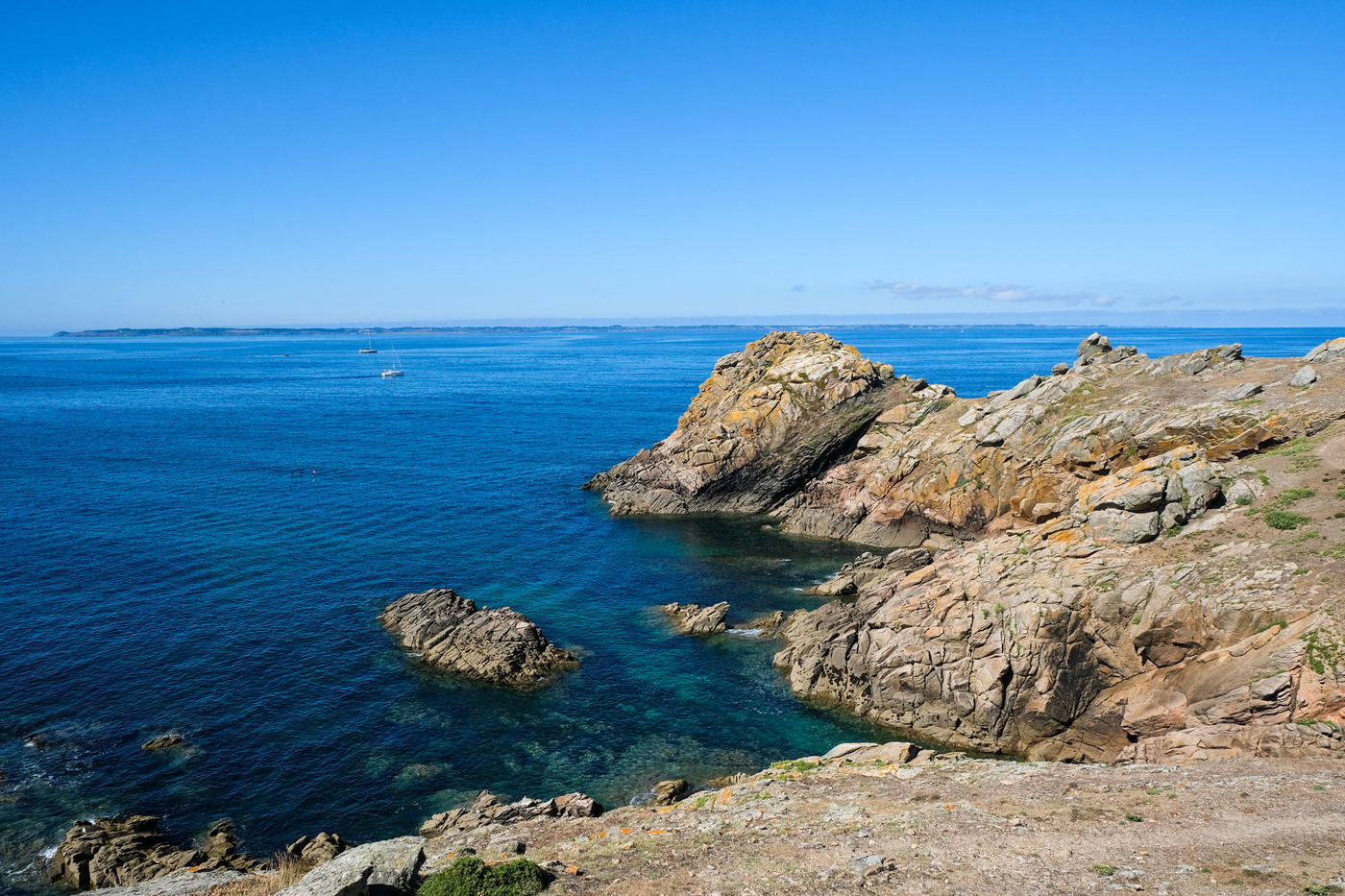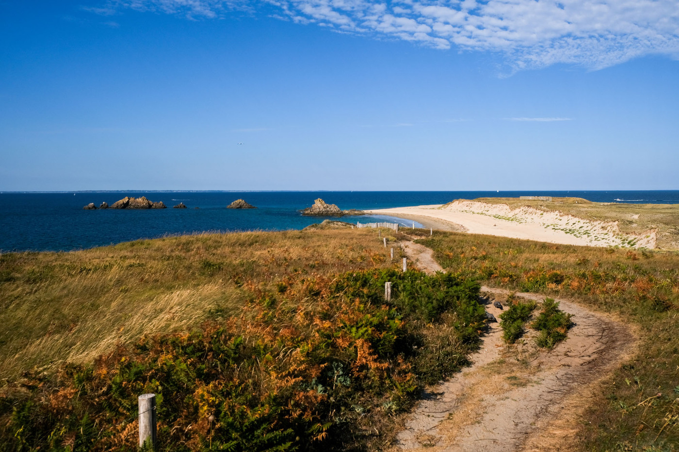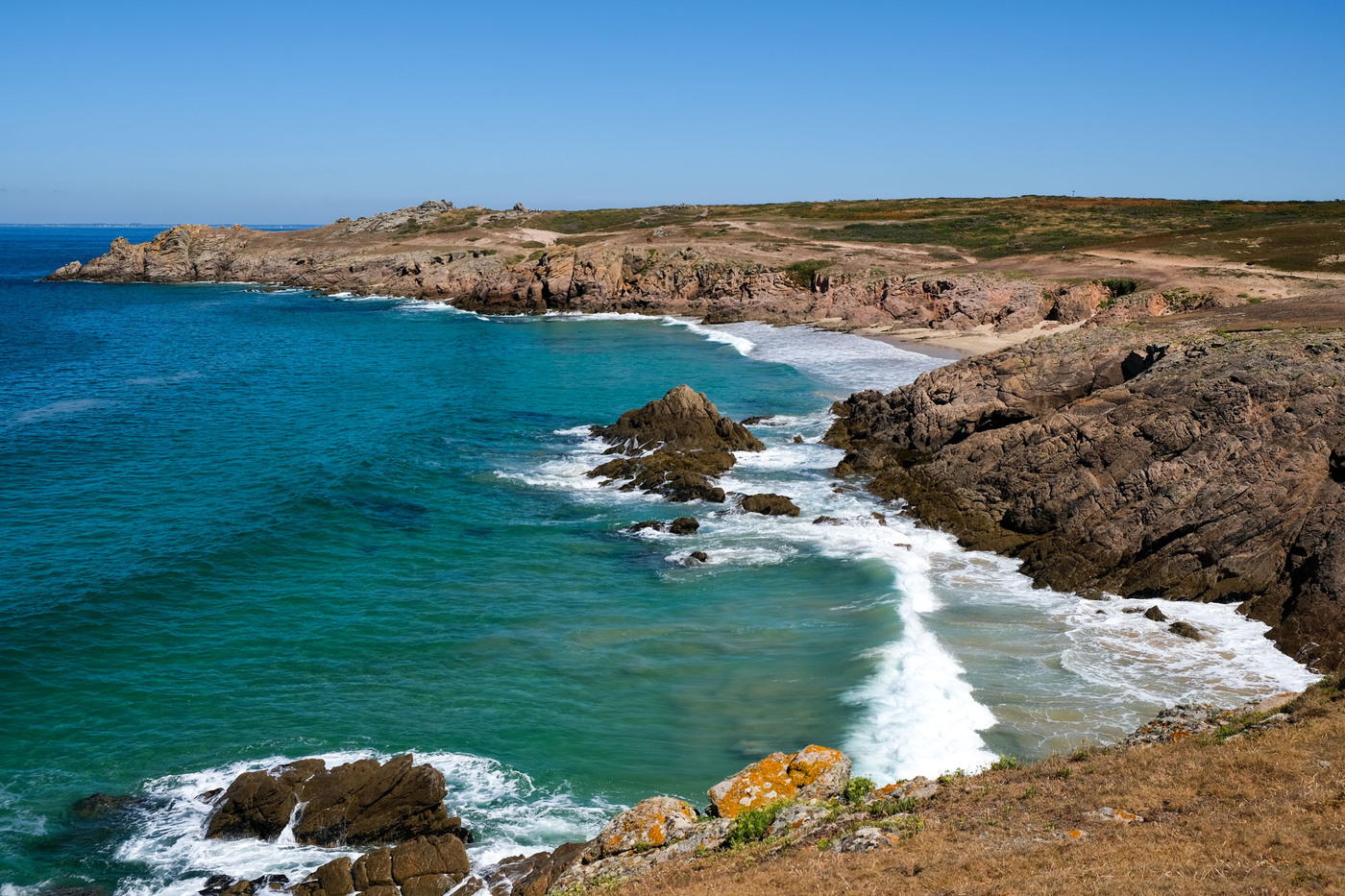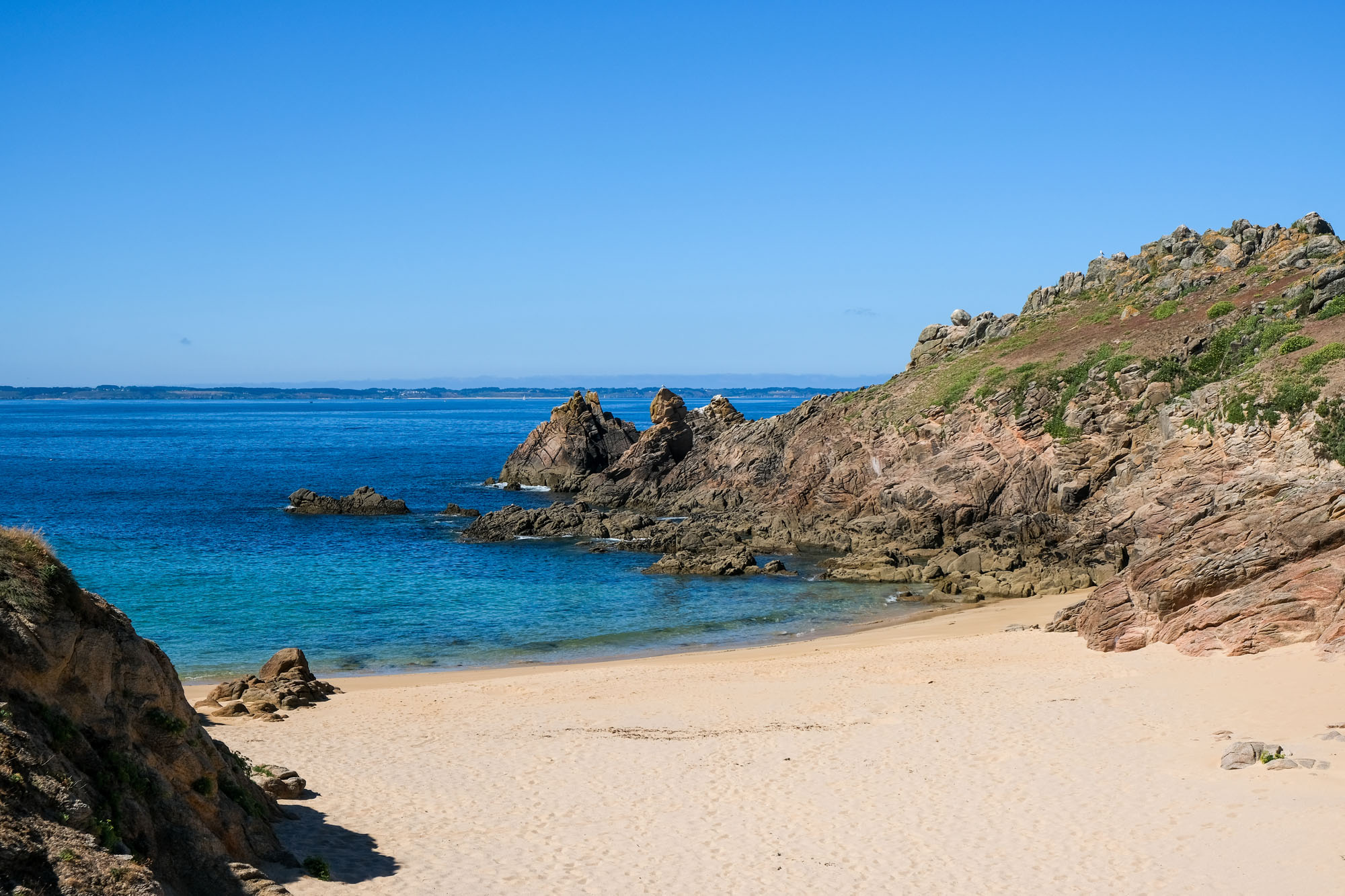– les deux tiers ouest, qui sont un ultime vestige perdu en mer des crêtes autrefois élevées du Massif armoricain. La côte y est particulièrement déchirée, en particulier au Sud, résultat des assauts perpétuels de l’océan.