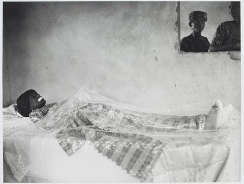 On plonge dans la photographie vernaculaire, avec cette étrange coutume qui consiste à photographier les morts sur leur lit, avant d’être enterrés. La bouche close avec du sparadrap, les narines bouchées avec du coton, les ventilateurs à fond, nous sommes dans le pays d’origine du vaudou. Photographier un mort c’est conserver son esprit. Okwui Envezor nous apprend dans son introduction trop savante que ce genre de photo se retrouve tous les jours dans les journaux locaux. D’une façon générale les gens ne sourient guère, les enfants avec leur air grave ressemblent à des adultes déguisés. Les adultes ont parfois des attitudes enfantines, on voit un gendarme qui prend une pose de pin up, le pistolet à la main, un autre est déguisé en gendarme et porte des bas blancs troués. Prostitués, maquereau, étrange pêcheur androgyne à la pause lascive dans un short court, hyper moulant, jeunes communiantes qui deviendront peut être prostituées, grandes prêtresse d’Hébiesso (dieu du tonnerre) qui posent avec un petit cheval gonflable en pastique, délinquants portant une ardoise autour du cou où est inscrit leur méfait, chefs de village, familles, voilà l’univers mystérieux que nous font découvrir ces archives qui étaient probablement vouées à la disparition. On peut passer des heures à regarder ces photos qui sont pleines de détail et imaginer la vie de ces anonymes qui ont vécu dans le plus grand dénuement et dont l’image se trouve aujourd’hui dans les rayons des temples de la consommation.