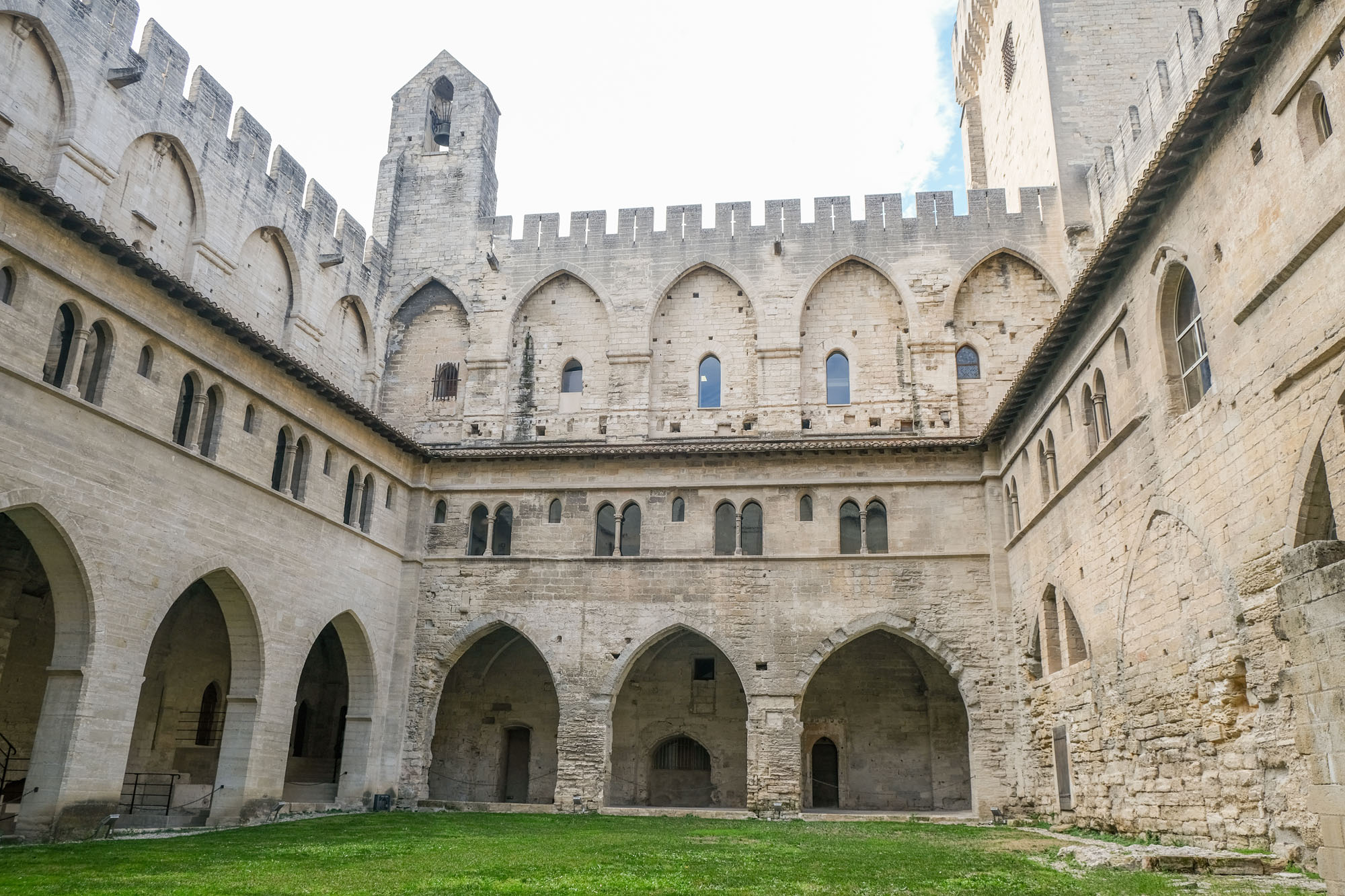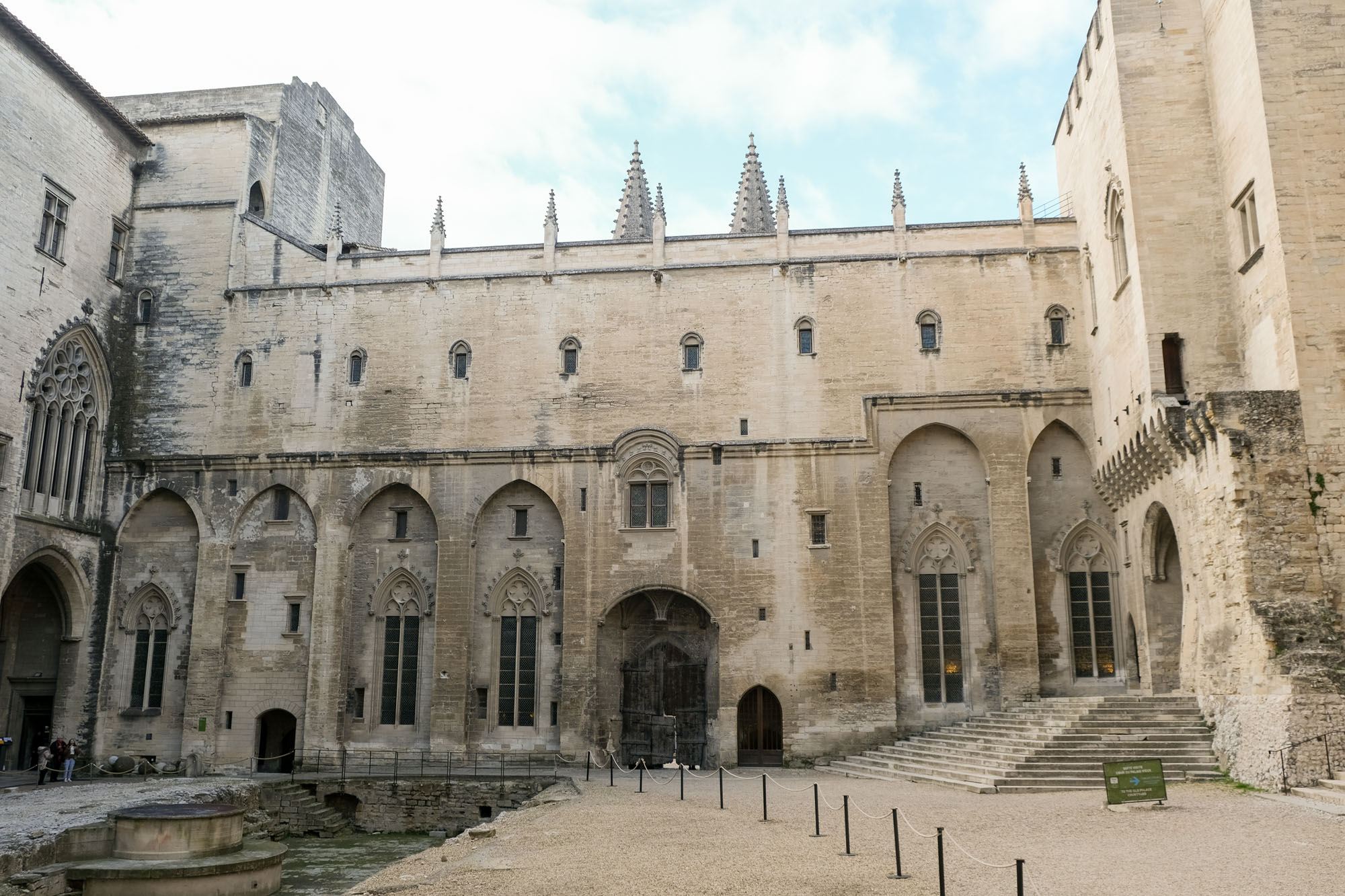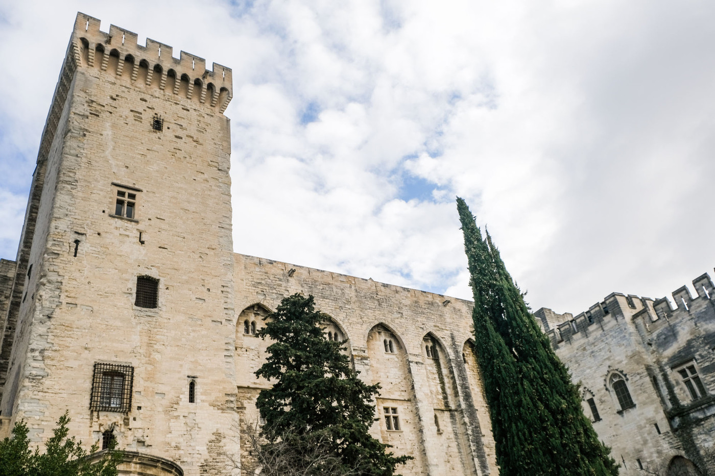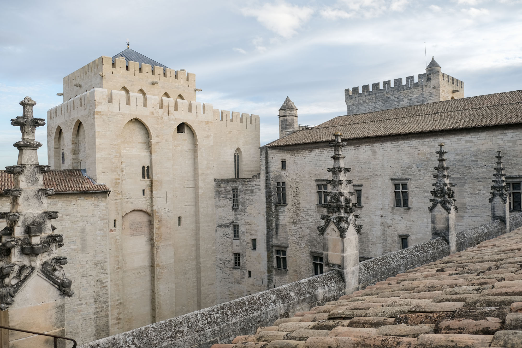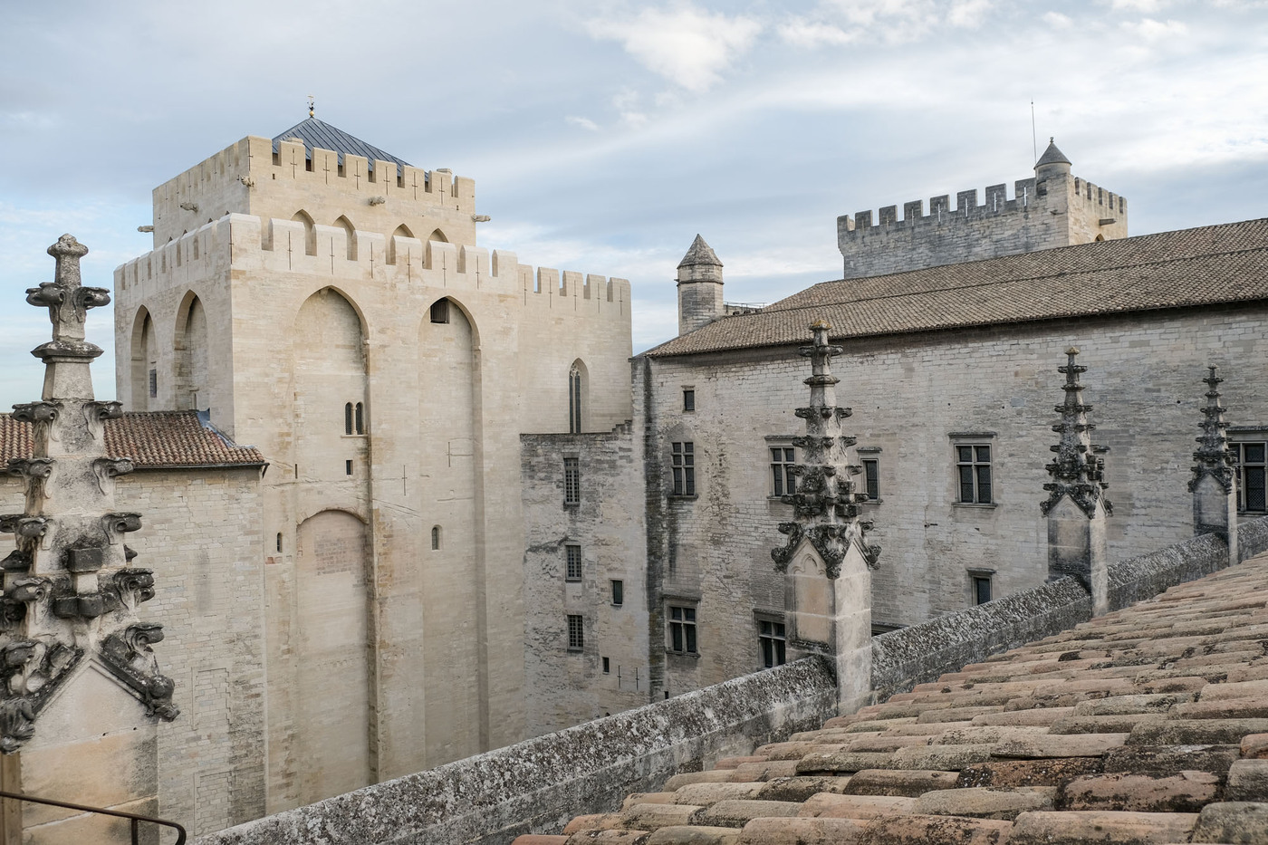 Le Palais des papes d’Avignon est la plus grande des constructions gothiques du Moyen Âge. À la fois forteresse et palais, la résidence pontificale fut pendant le XIVe siècle le siège de la chrétienté d’Occident. Le palais, qui est l’imbrication de deux bâtiments, le palais vieux de Benoît XII, véritable forteresse assise sur l’inexpugnable rocher des Doms, et le palais neuf de Clément VI, le plus fastueux des pontifes avignonnais. Il est le fruit, pour sa construction et son ornementation, du travail conjoint des meilleurs architectes français, Pierre Peysson et Jean de Louvres, dit de Loubières, et des plus grands fresquistes de l’école siennoise, Simone Martini et Matteo Giovanetti. Source : Wikipédia