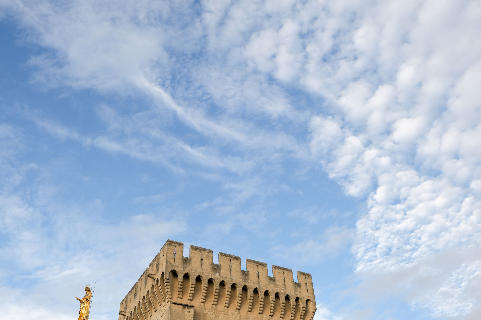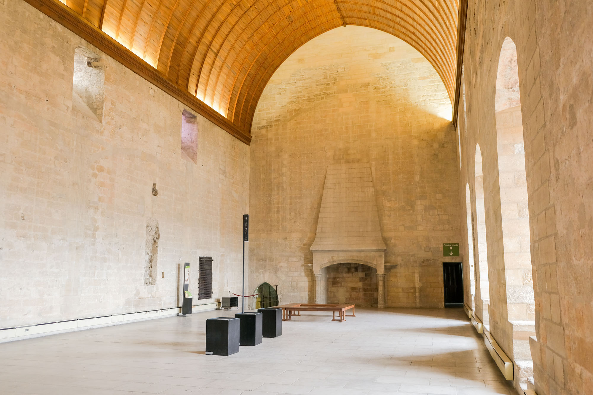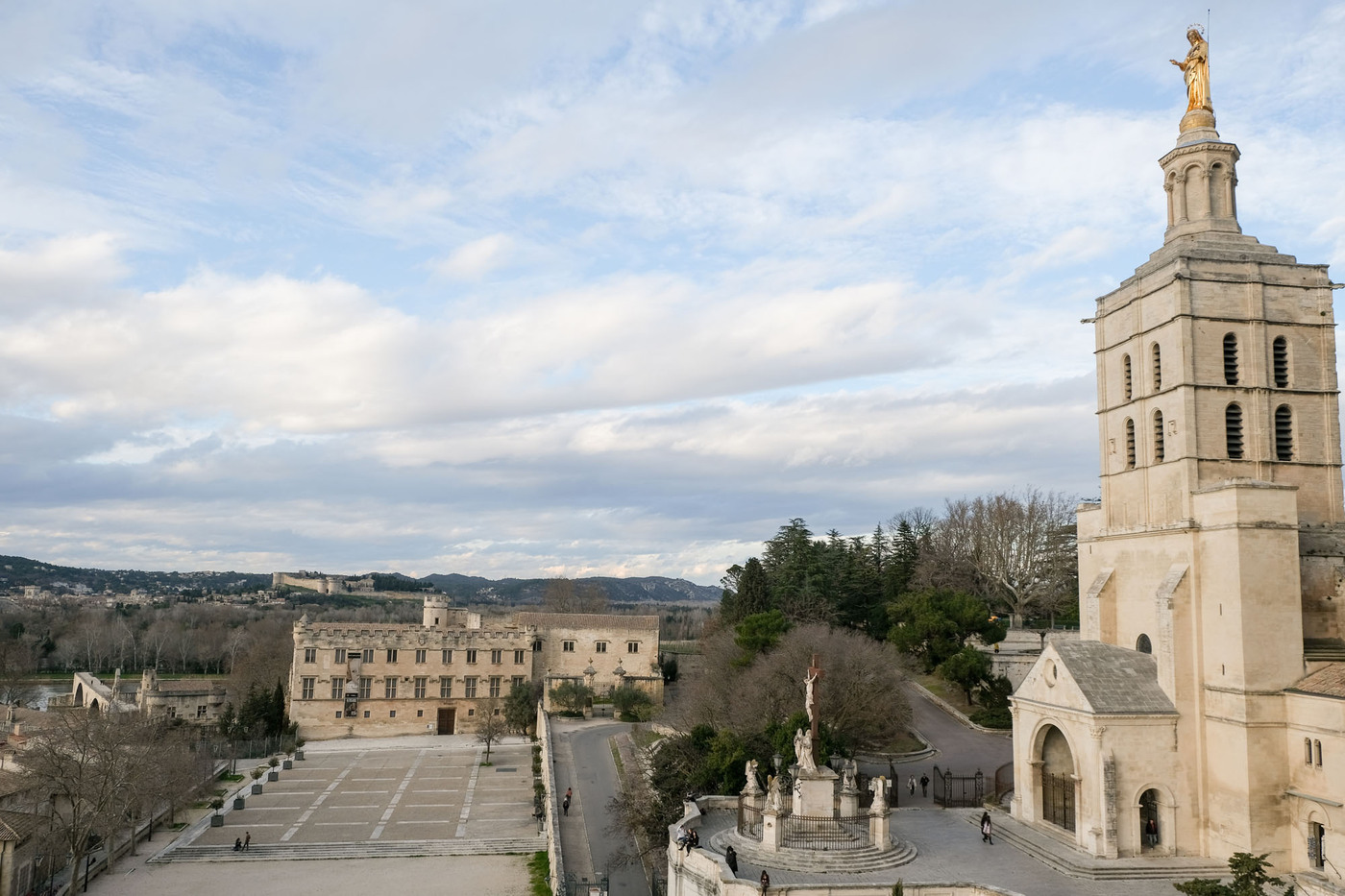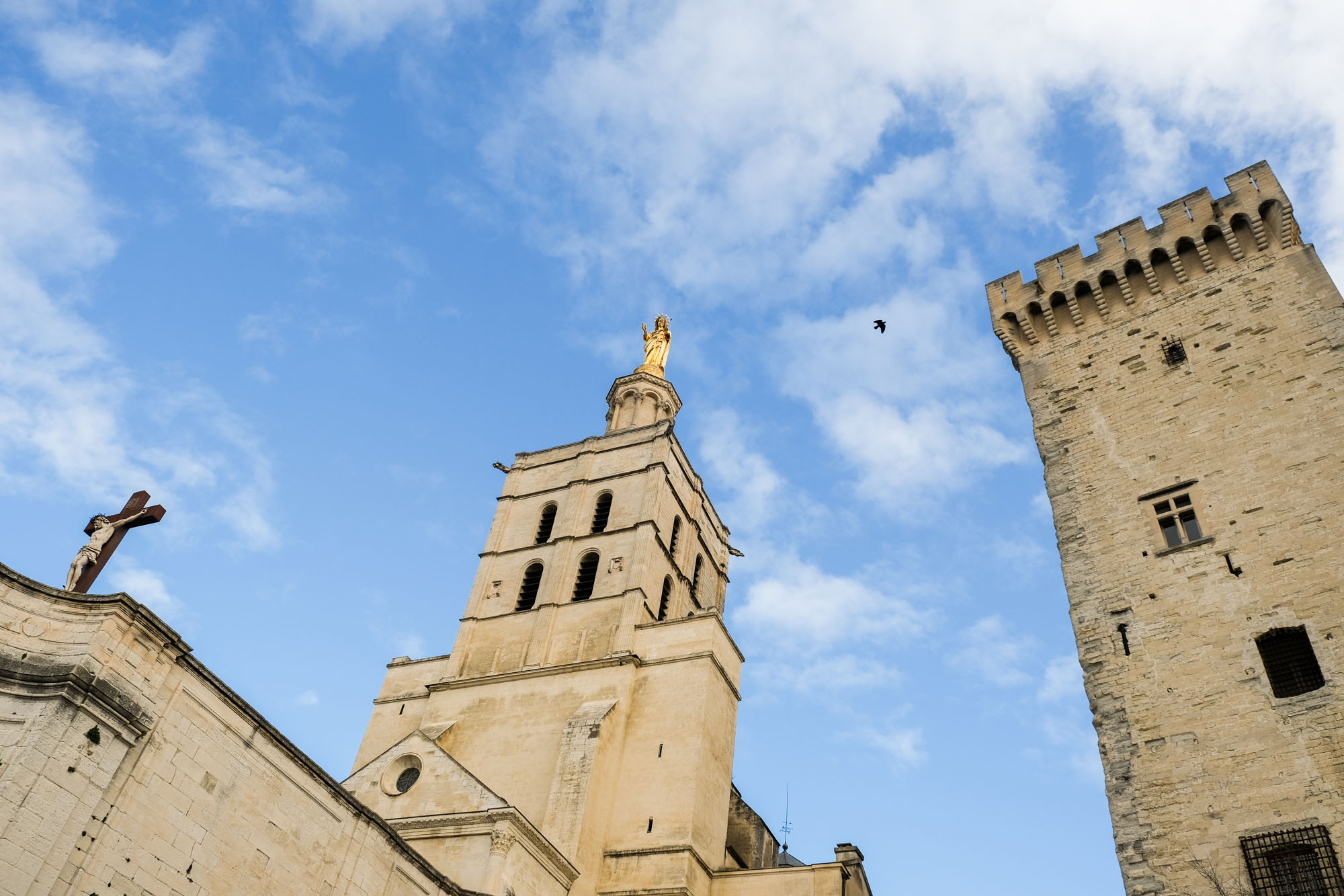 Le Palais des papes d’Avignon est la plus grande des constructions gothiques du Moyen Âge. À la fois forteresse et palais, la résidence pontificale fut pendant le XIVe siècle le siège de la chrétienté d’Occident. Le palais, qui est l’imbrication de deux bâtiments, le palais vieux de Benoît XII, véritable forteresse assise sur l’inexpugnable rocher des Doms, et le palais neuf de Clément VI, le plus fastueux des pontifes avignonnais. Il est le fruit, pour sa construction et son ornementation, du travail conjoint des meilleurs architectes français, Pierre Peysson et Jean de Louvres, dit de Loubières, et des plus grands fresquistes de l’école siennoise, Simone Martini et Matteo Giovanetti. Source : Wikipédia