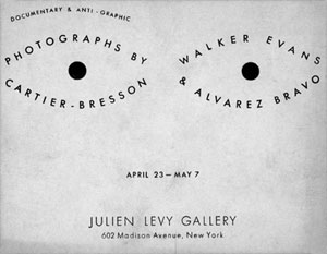 Julien Levy présente en 1933 la première exposition d’Henri Cartier-Bresson avec le titre étrange d’« anti-graphic photographs ». Dans l’introduction à cette exposition il définissait l’approche photographique de Cartier-Bresson comme « anti-graphique » par opposition à la photographie comme « art graphique ». Il voulait montrer des photos brutes, des instantanés, la vie de la rue avec ses passants, des clochards, des bordels, en opposition aux images aseptisées.