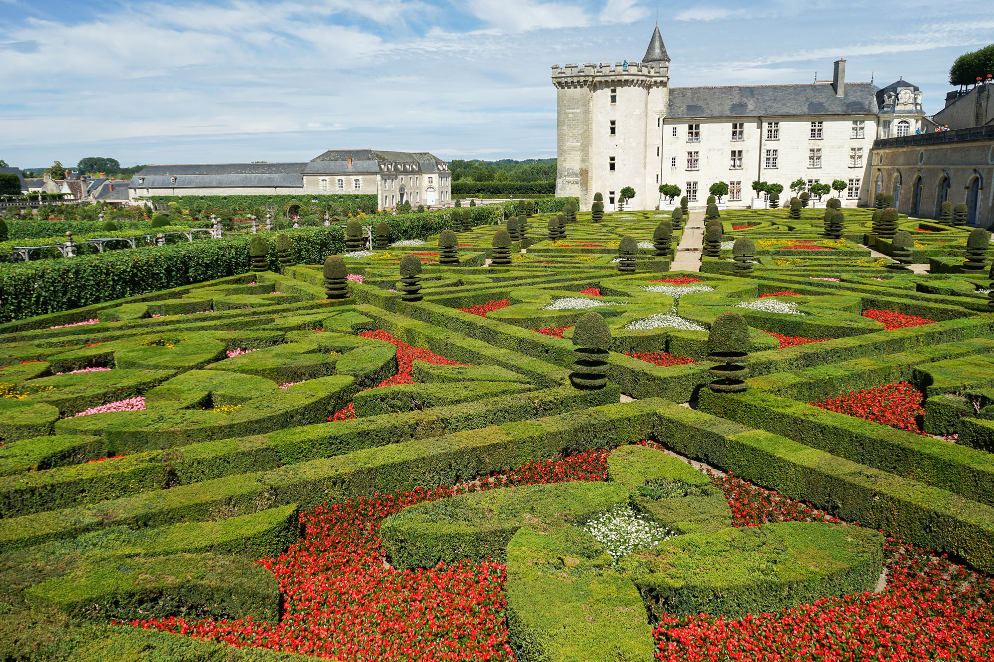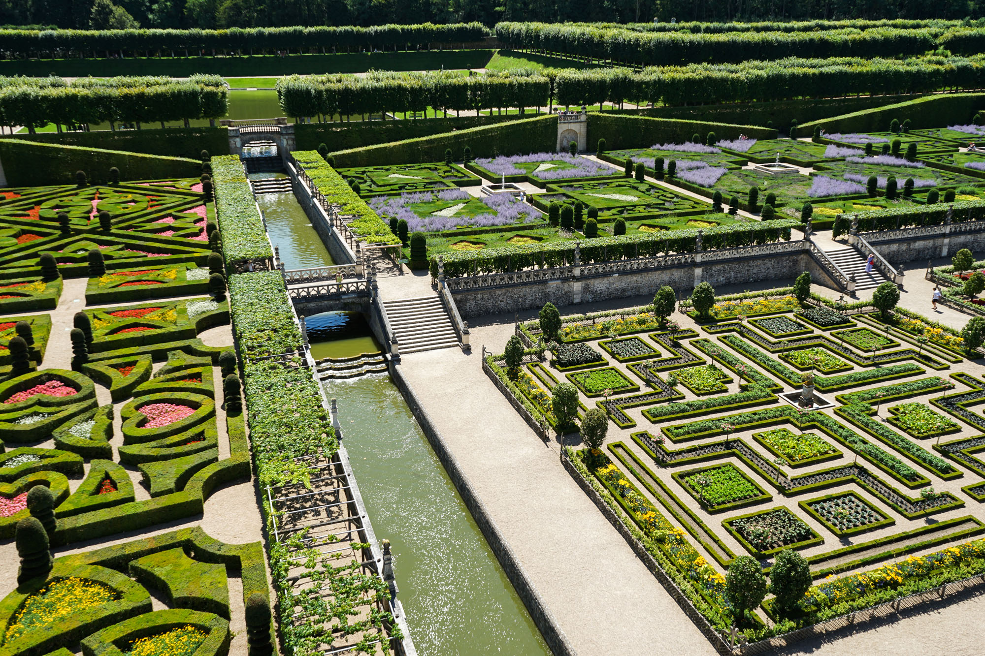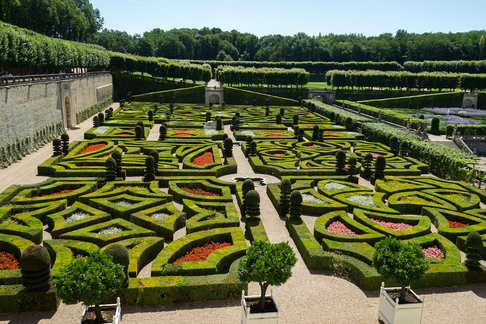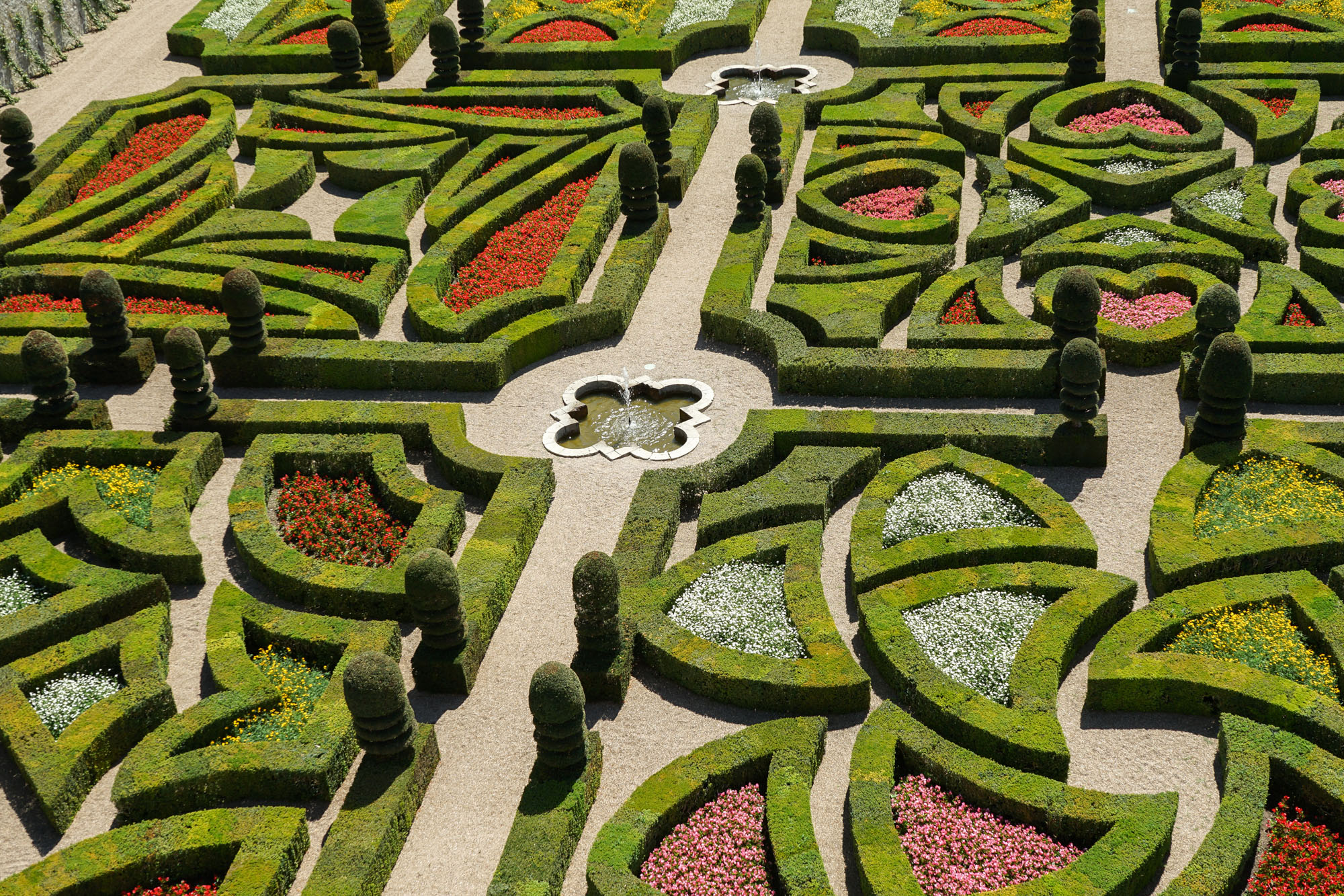 Les jardins de Villandry jouxtent les façades du château. Ils sont répartis sur trois niveaux, chacune des terrasses accueillant une typologie de jardin : le jardin Potager, le jardin d’Eau et le jardin d’Ornement. Telle une prolongation des salons intérieurs, le jardin d’ornement est lui-même divisé en salons de verdure. L’aménagement de cette partie des jardins est l’œuvre de Lozano, artiste peintre sévillan, assisté du peintre et paysagiste Javier de Winthuysen. Source : www.chateauvillandry.fr