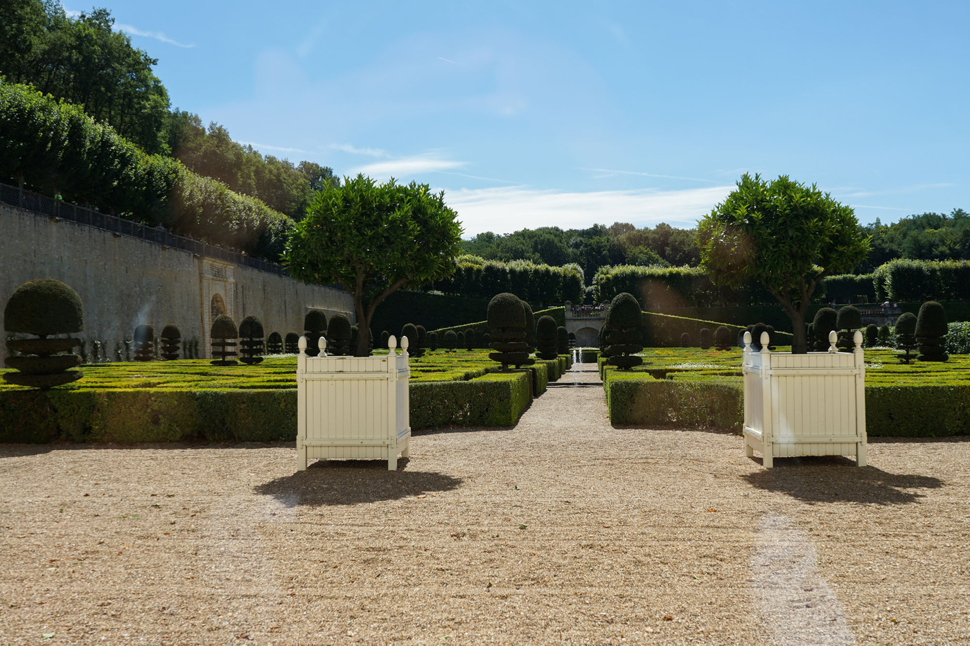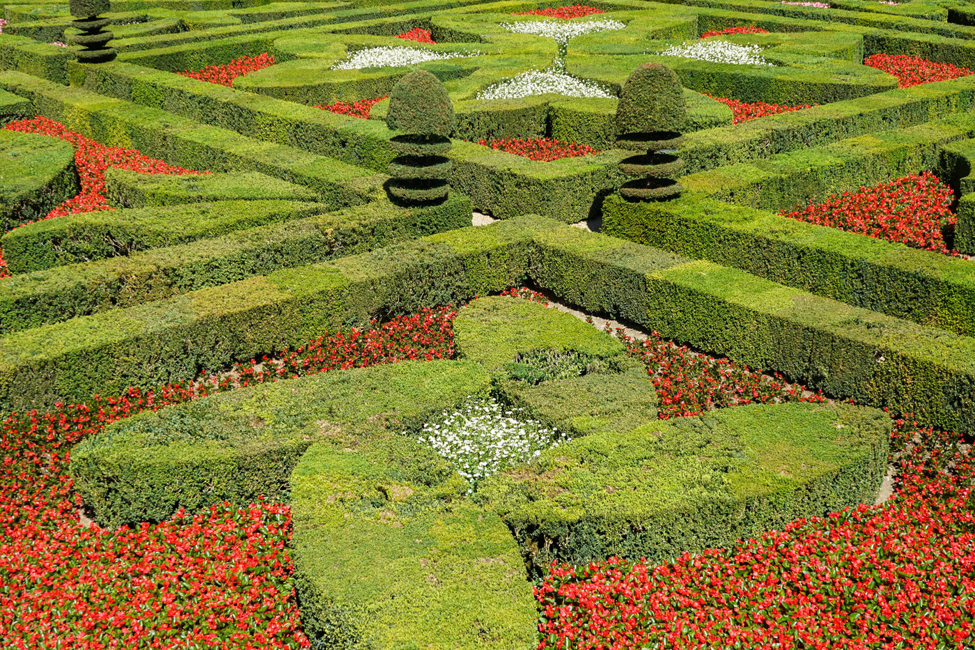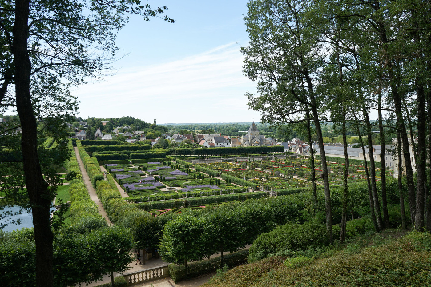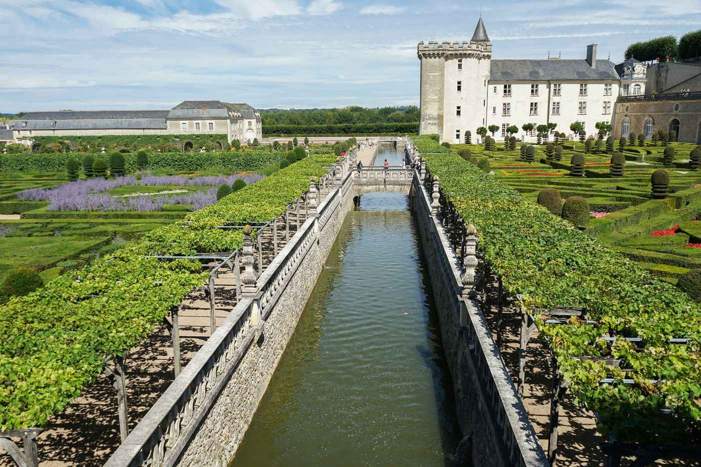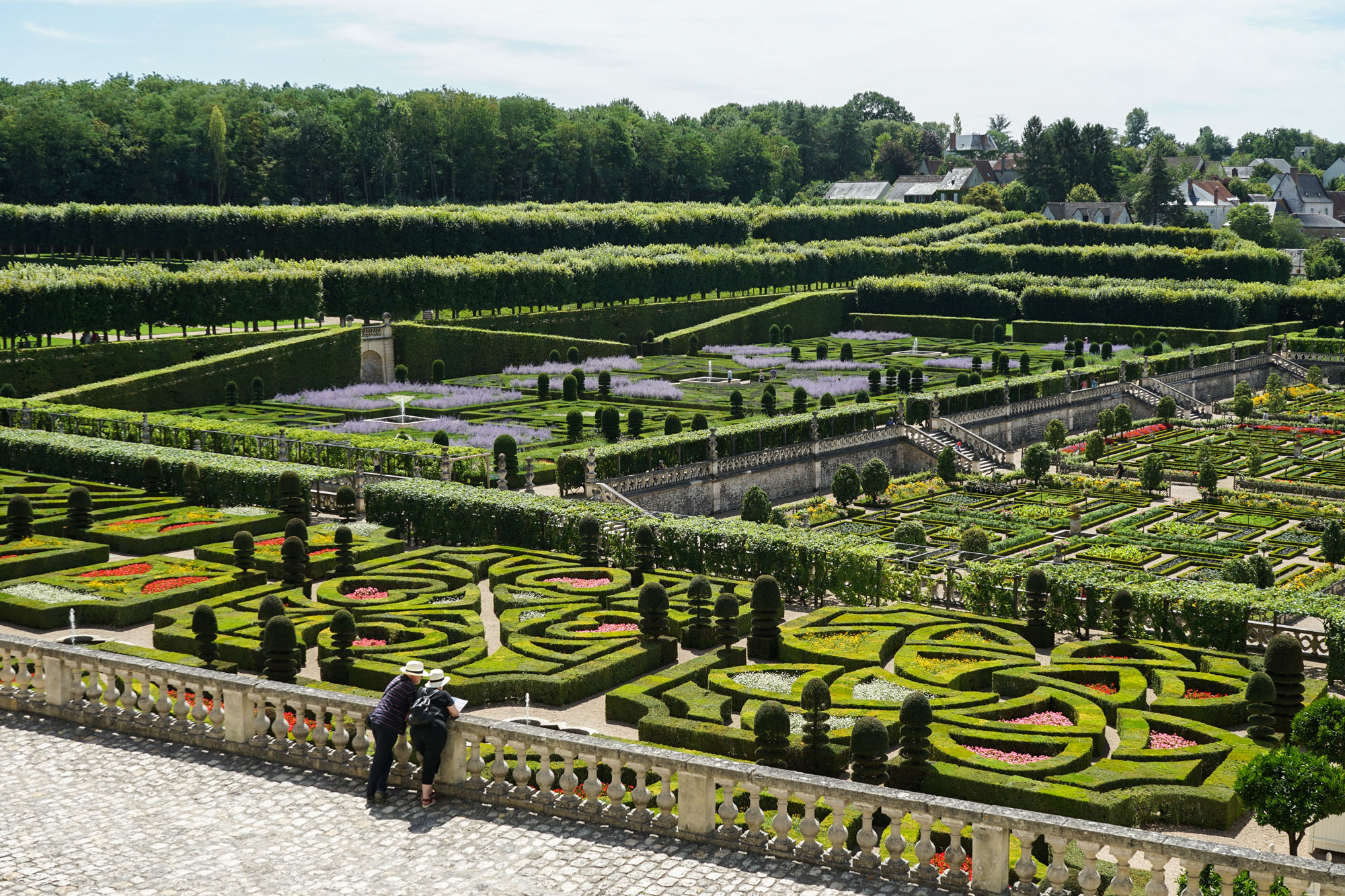 Les jardins de Villandry jouxtent les façades du château. Ils sont répartis sur trois niveaux, chacune des terrasses accueillant une typologie de jardin : le jardin Potager, le jardin d’Eau et le jardin d’Ornement. Telle une prolongation des salons intérieurs, le jardin d’ornement est lui-même divisé en salons de verdure. L’aménagement de cette partie des jardins est l’œuvre de Lozano, artiste peintre sévillan, assisté du peintre et paysagiste Javier de Winthuysen. Source : www.chateauvillandry.fr