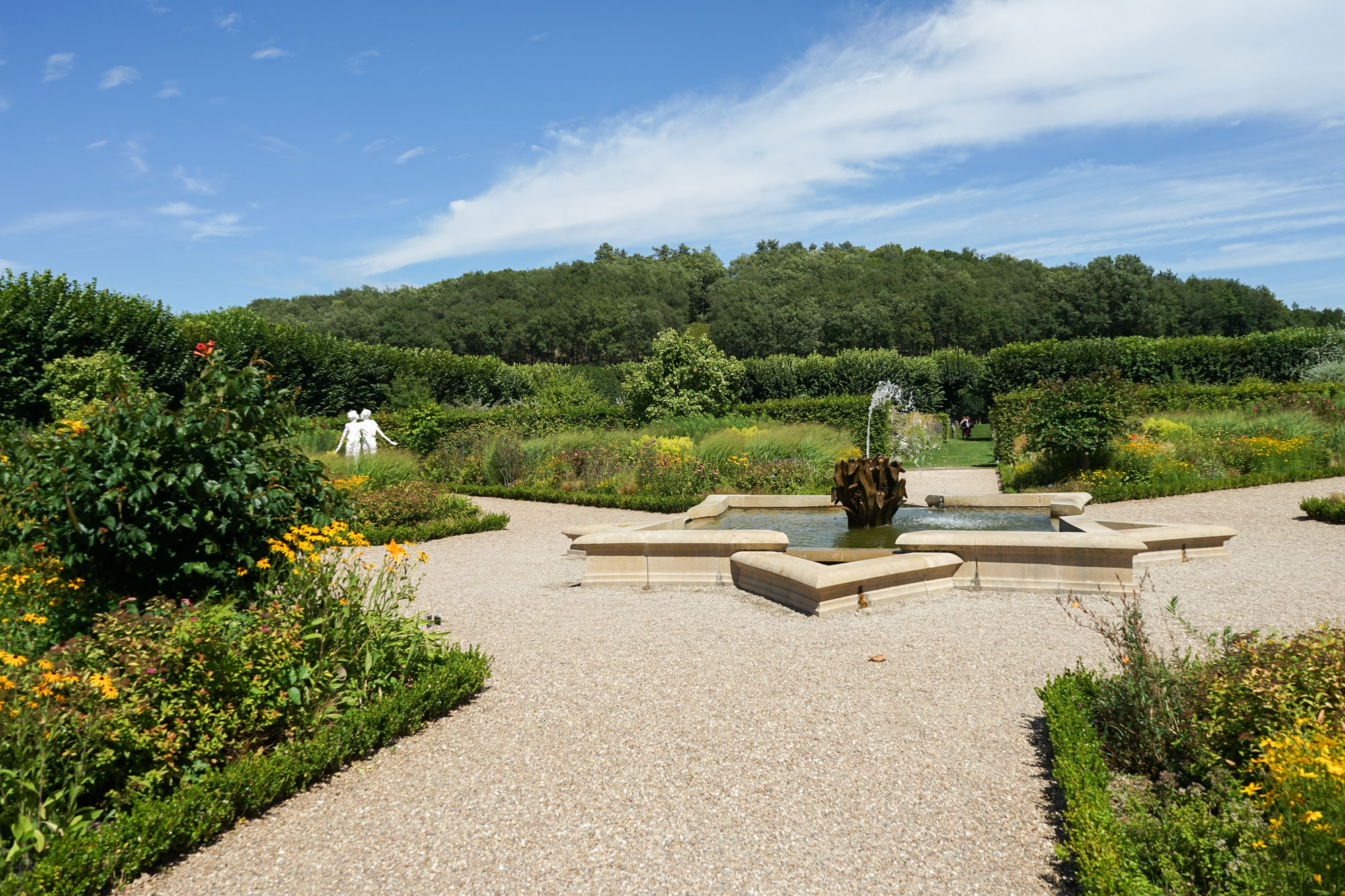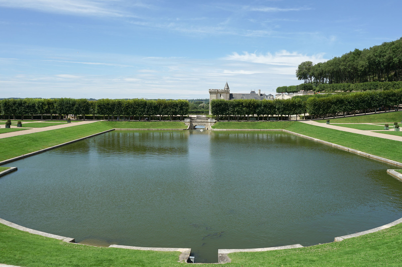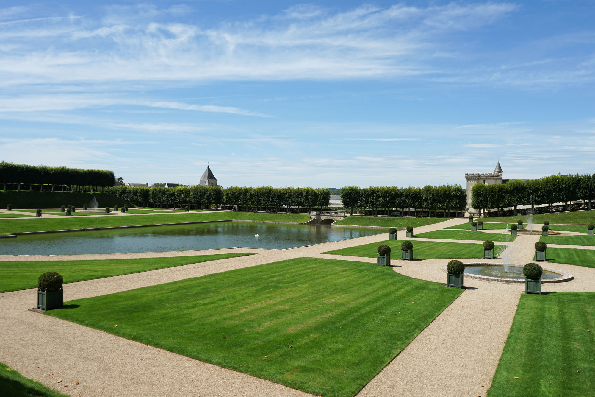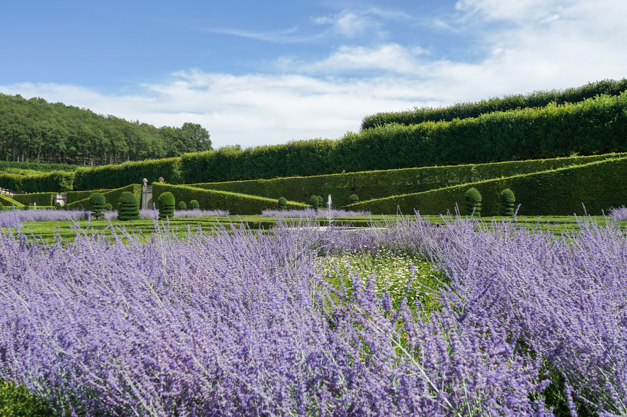 Les jardins de Villandry jouxtent les façades du château. Ils sont répartis sur trois niveaux, chacune des terrasses accueillant une typologie de jardin : le jardin Potager, le jardin d’Eau et le jardin d’Ornement. Telle une prolongation des salons intérieurs, le jardin d’ornement est lui-même divisé en salons de verdure. L’aménagement de cette partie des jardins est l’œuvre de Lozano, artiste peintre sévillan, assisté du peintre et paysagiste Javier de Winthuysen. Source : www.chateauvillandry.fr