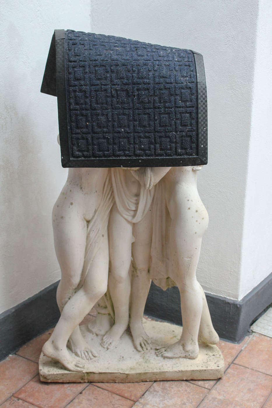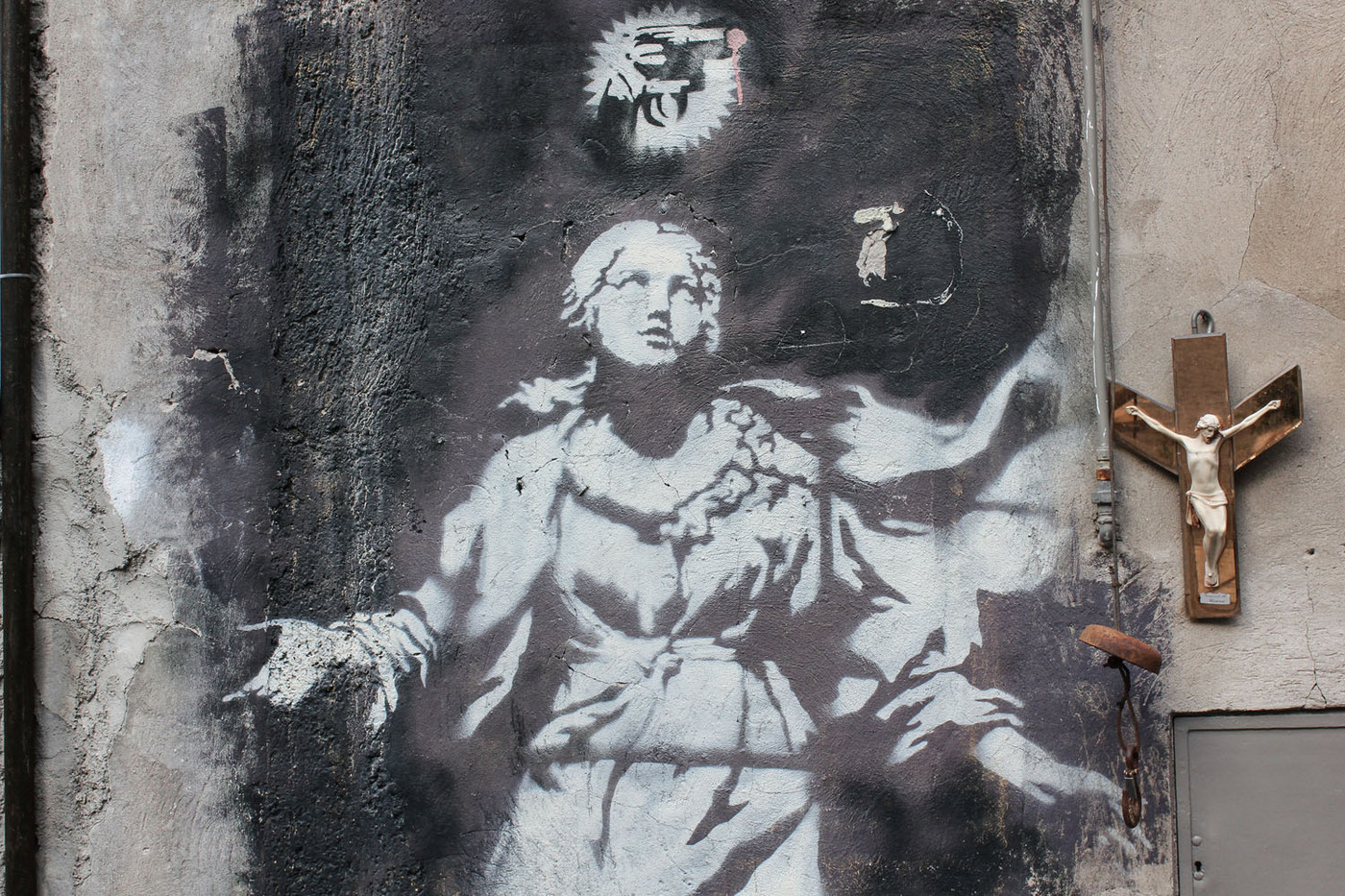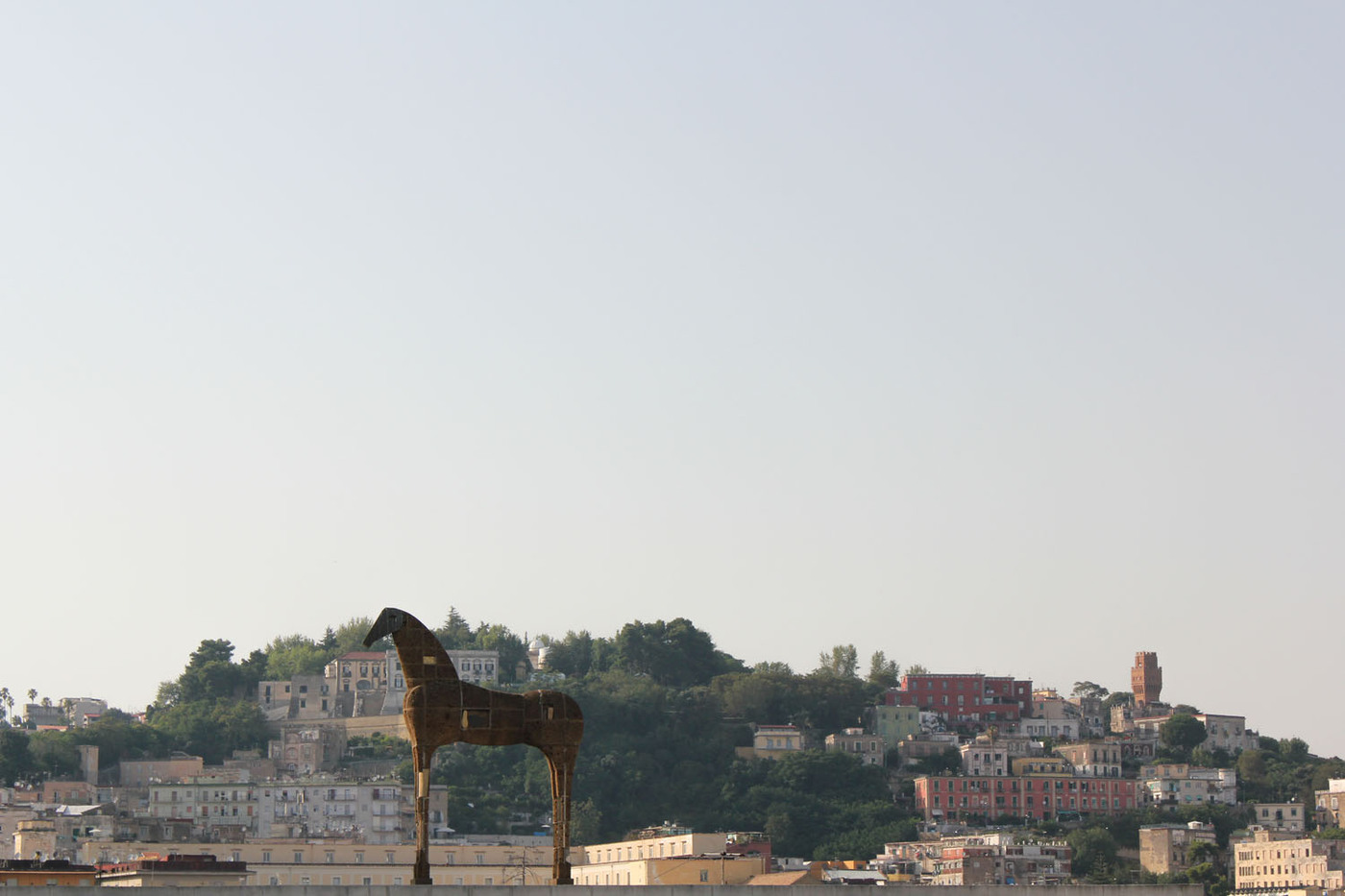 Naples est pleine de surprises visuelles, on arrive sur une grande place où la statue de Dante semble soupeser le globe de ‘éclairage public, un peu plus loin le plafond d’une salle d’un palais du 16eme siècle nous montre une représentation des rayons du soleil comme on en voit aujourd’hui dans les mangas et puis sur une petite place Bransky est passė par là. A une heure de bateau, sur l’ile de Capri, une femme de ménage a posé négligemment le tapis de l’entrée de la maison sur une reproduction miniature d’une statue des trois grâces…