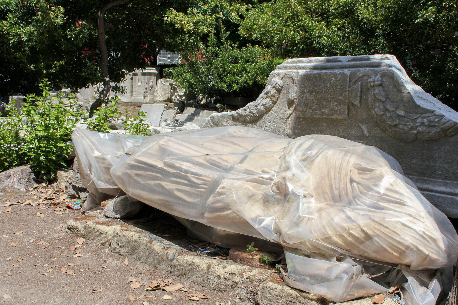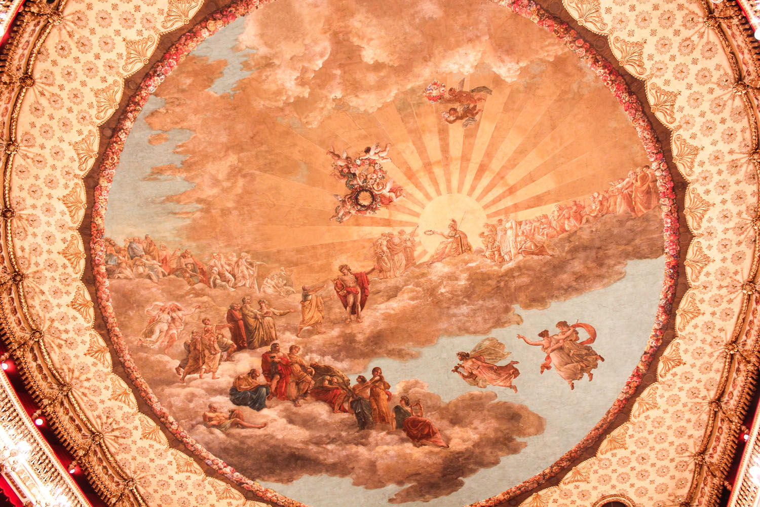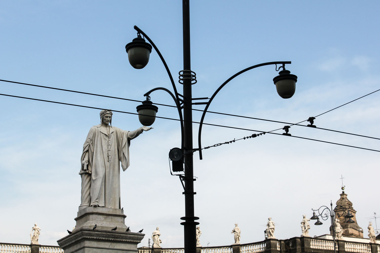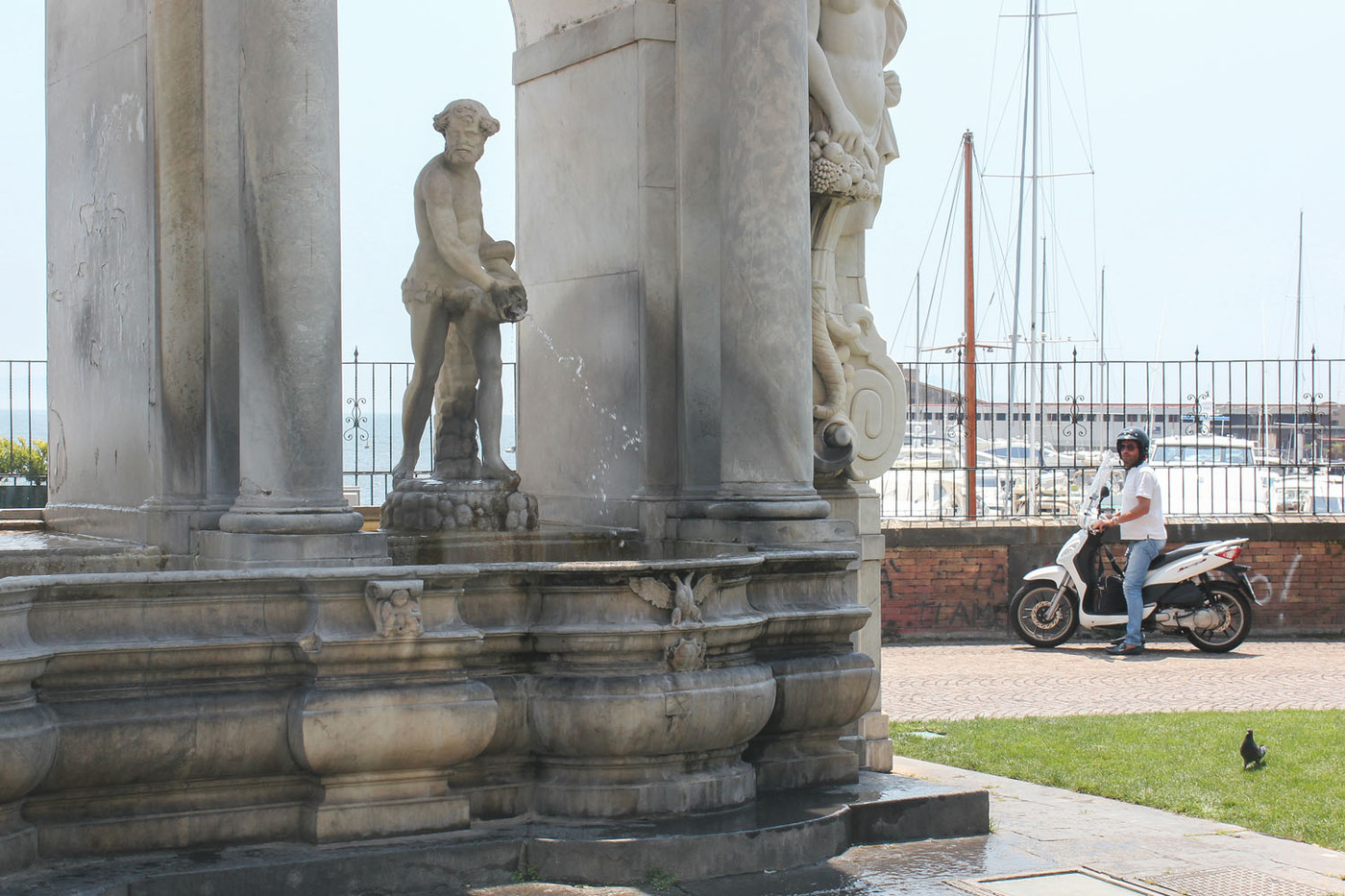 Naples est pleine de surprises visuelles, on arrive sur une grande place où la statue de Dante semble soupeser le globe de ‘éclairage public, un peu plus loin le plafond d’une salle d’un palais du 16eme siècle nous montre une représentation des rayons du soleil comme on en voit aujourd’hui dans les mangas et puis sur une petite place Bransky est passė par là. A une heure de bateau, sur l’ile de Capri, une femme de ménage a posé négligemment le tapis de l’entrée de la maison sur une reproduction miniature d’une statue des trois grâces…