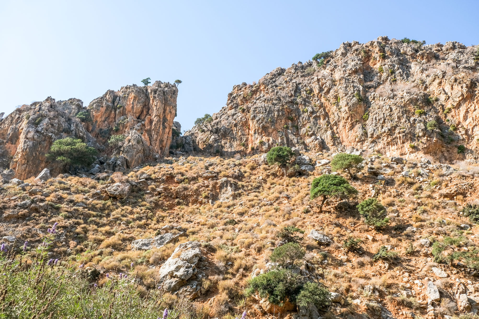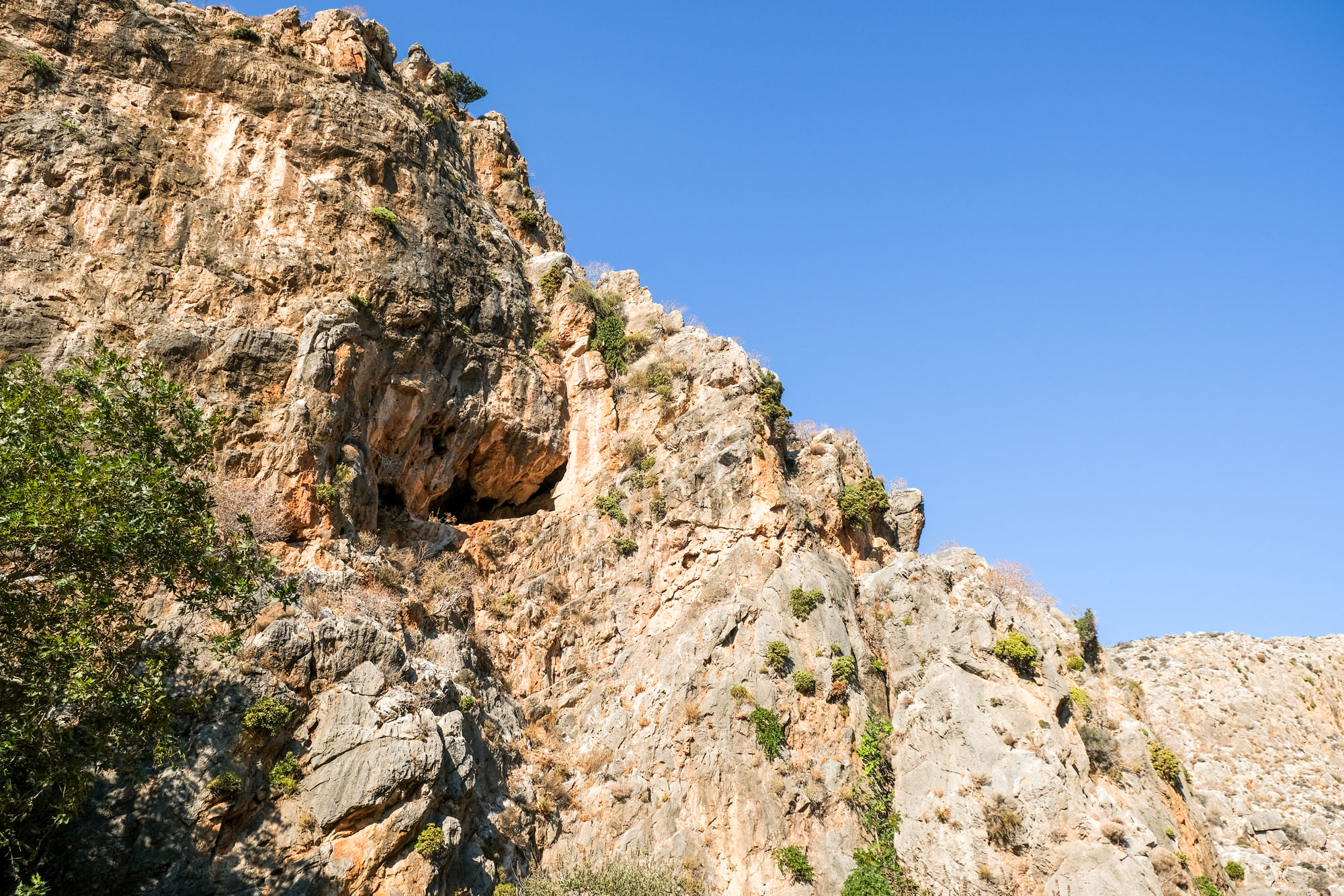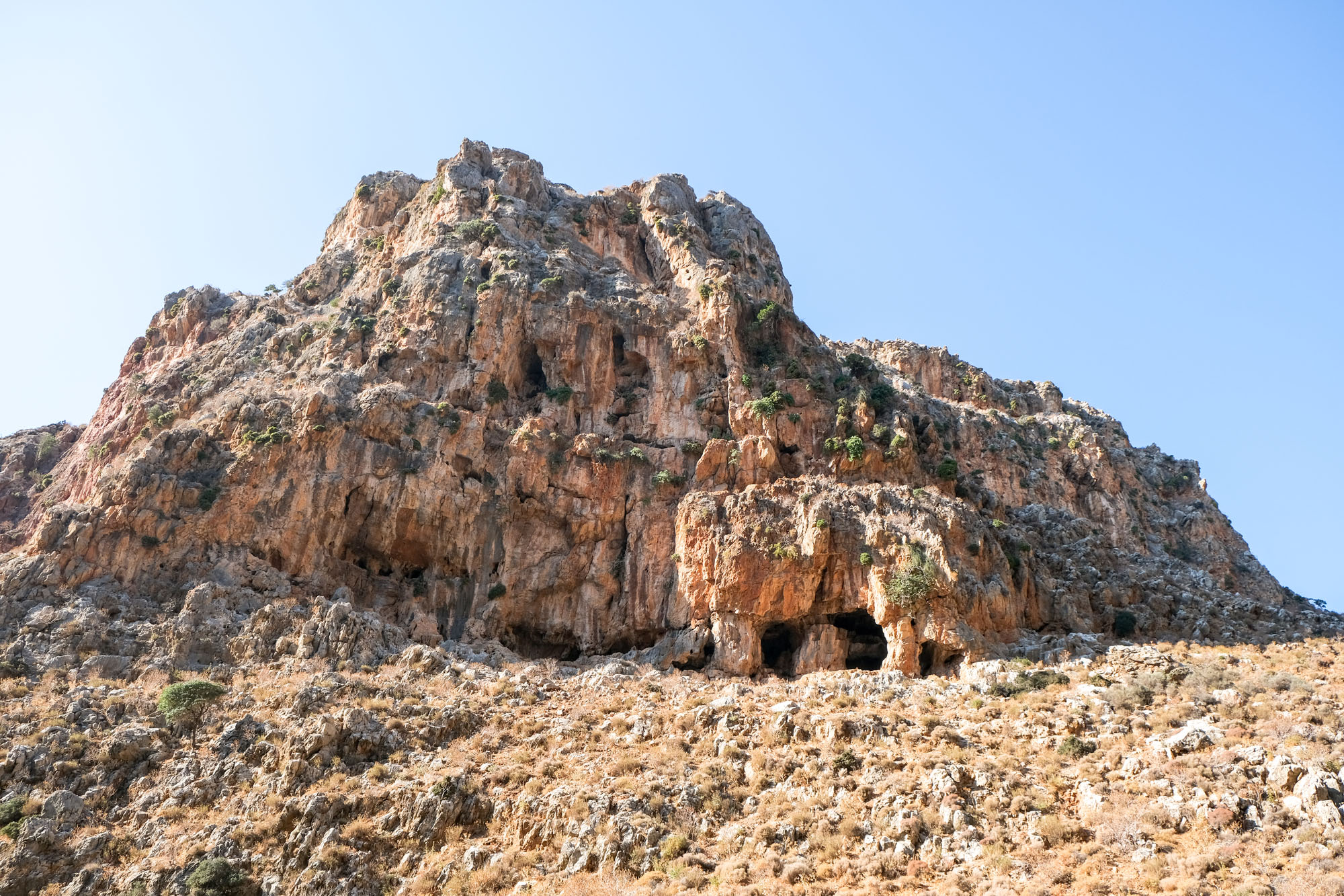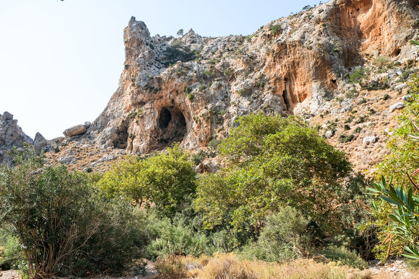 On parle de Gorge des morts et non pas de la Vallée de la mort car le lieu servait de cimetière à la période minoenne. Les morts étaient placés dans des grottes et excavations qui se trouvent sur les parois de la gorge. L’endroit n’a rien. Le sentier serpente au milieu du lit à sec de la rivière, il est très facile à suivre. Le fond de l’oued conserve une certaine humidité, les plantes survivent en toutes saisons.