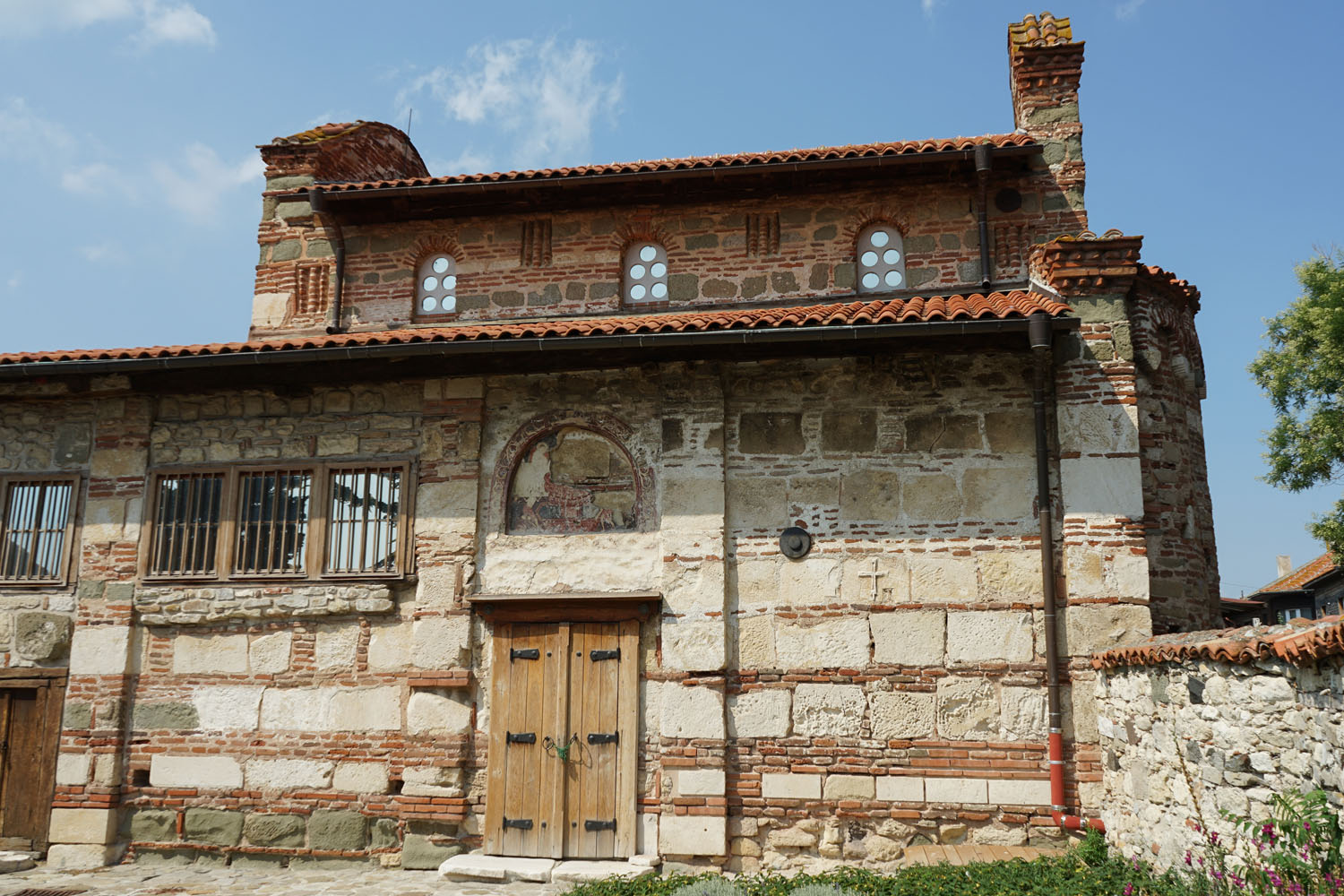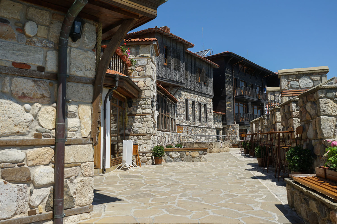Selon les régions, vous observerez différents types de demeures, variations locales autour de ce schéma unique : à Melnik comme dans les Rhodopes ( Kovačevica , Široka Lăka ), les maisons qualifiées parfois de « forteresses », reposent sur de très hauts soubassements de pierres aux murs très épais et aux ouvertures rares, au sommet desquels les étages d’habitation semblent être posés. En bordure de la mer Noire, à Nesebăr comme à Sozopol , les murs extérieurs sont entièrement revêtus de panneaux de bois. Dans le Balkan central, à Žeravna ou à Kotel , c’est le bois qui est le matériau principal.