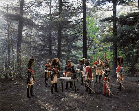 On sent chez cet homme de 56 ans une nostalgie de l’enfance, on l’imagine allongé le nez dans ses petits soldats, mettant en scène des conseils de guerre, des batailles, des chevauchées folles. La technique permet à l’adulte de faire revivre ses souvenirs d’enfance et donne un résultat saisissant et déroutant. John Massey prend en photo des paysages réels et y incorpore l’image de soldats de plomb de l’armée napoléonienne en les mettant à l’échelle du paysage. Au premier coup d’œil notre cerveau, après une hésitation décode qu’il ne s’agit pas d’un personnage réel, puis il nous indique qu’il y a une anormalité dans l’image que l’on regarde. En effet comment un petit soldat peut-il se retrouver dans un paysage à l’échelle humaine ? Le montage est si bien fait que l’œil va ausculter l’image pour analyser l’aberration qu’il détecte. John Massey joue de cet effet et retranscrit sur des grands formats une imagerie originale de scènes de guerre. Il ne se limite pas à l’époque napoléonienne. Ainsi, il incorpore un combattant gaulois dans un sous bois, son attitude est la aussi très réaliste. L’imaginaire du jeune Massey est tout autant présent dans la photo d’un paysage enneigé où patrouillent d’étranges figurines du film « La planète des singes ». Il y a une volonté manifeste de magnifier la nature notamment à travers un éclairage subtil et d’y introduire l’homme comme un prédateur.