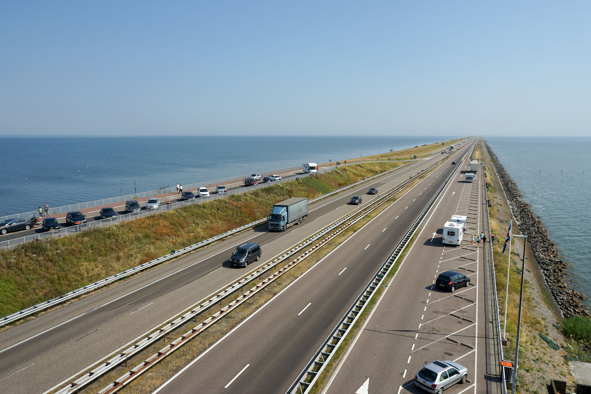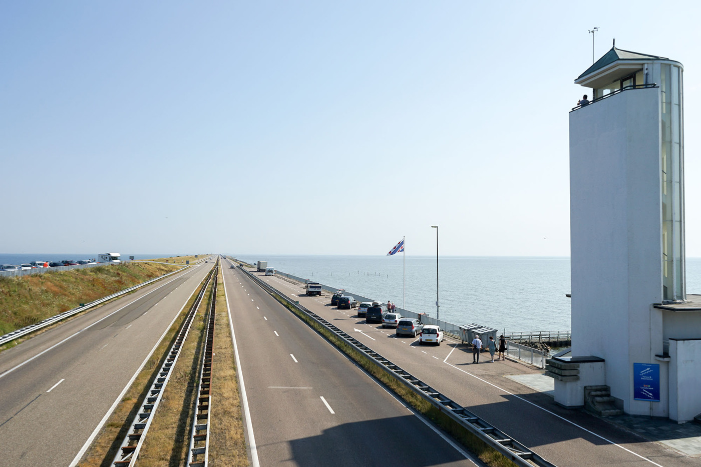 L’Afsluitdijk (« Digue de fermeture » en français) est une digue de grande taille de 32 km, située aux Pays-Bas, construite entre 1927 et 1933 et reliant Wieringen (province de Hollande-Septentrionale) à Súdwest-Fryslân (province de Frise). Au sens strict du terme, il ne s’agit pas d’une digue mais d’un barrage, puisque le niveau des eaux diffère de chaque côté (Source Wikipedia). Cette voie permet de se rendre dans la région de la Frise et de visiter des villes comme Leens et des villages comme Veenklooster et Oostmahorn par exemple.