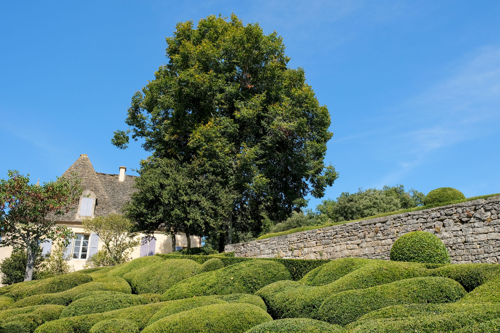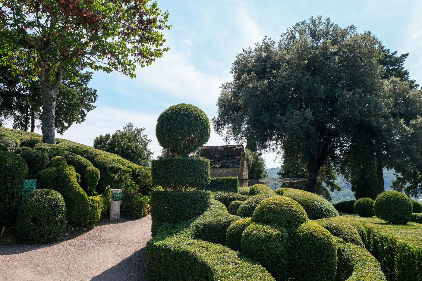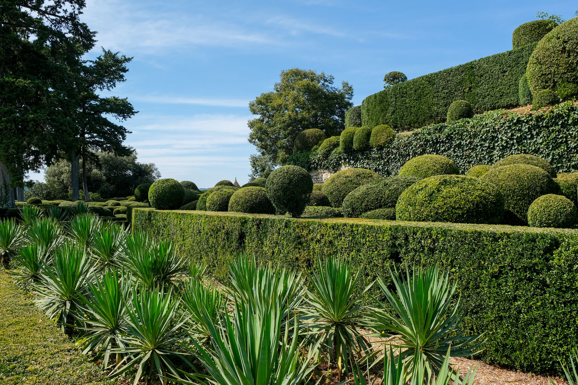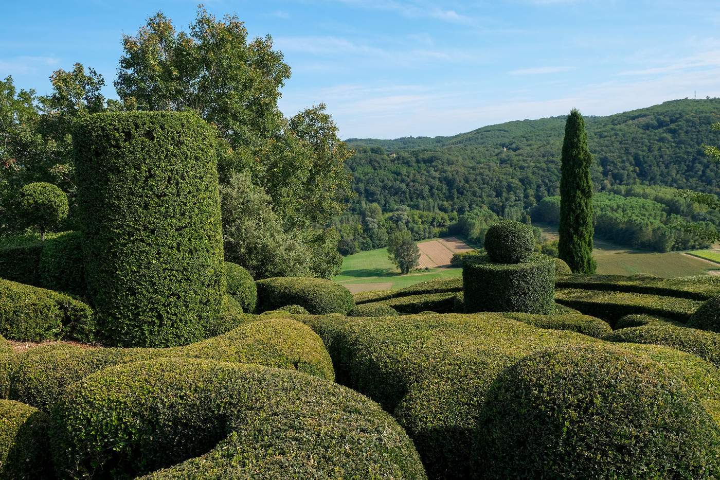 Aménagé sur un éperon rocheux, le parc de 22 hectares domine la vallée de ses hautes falaises. Site classé, les jardins romantiques et pittoresques de Marqueyssac offrent autour d’un château du début du XIXe siècle, plus de 6 kilomètres de promenades ombragées, bordées de 150 000 buis centenaires taillés à la main, et agrémentées de belvédères, rocailles, cascades et théâtres de verdure… Le buis est mis en valeur avec une fantaisie pleine de mouvement tout en rondeur et en taille moutonnante.