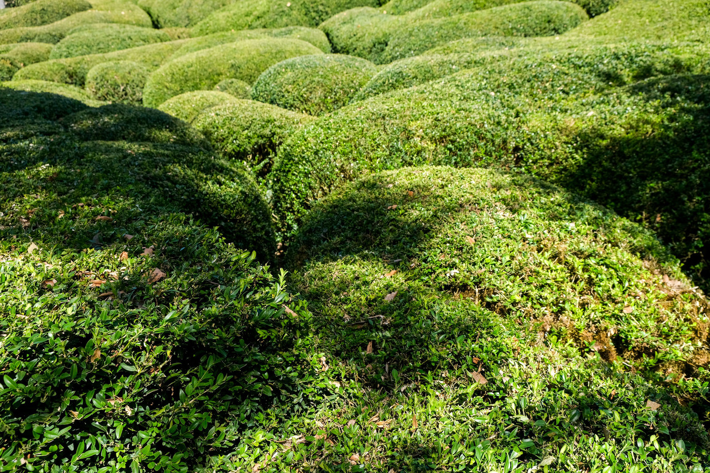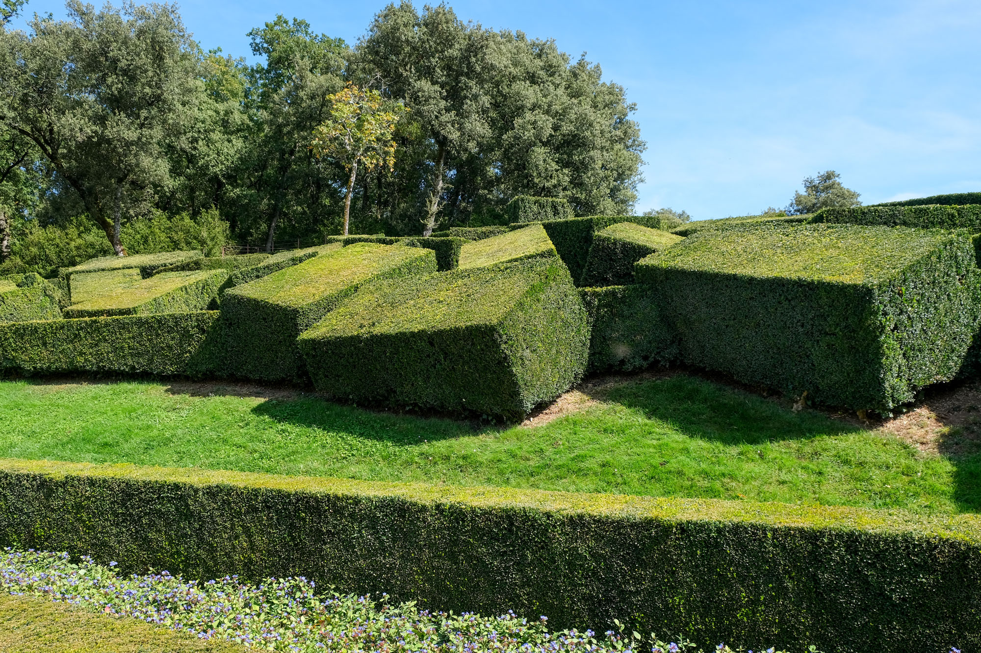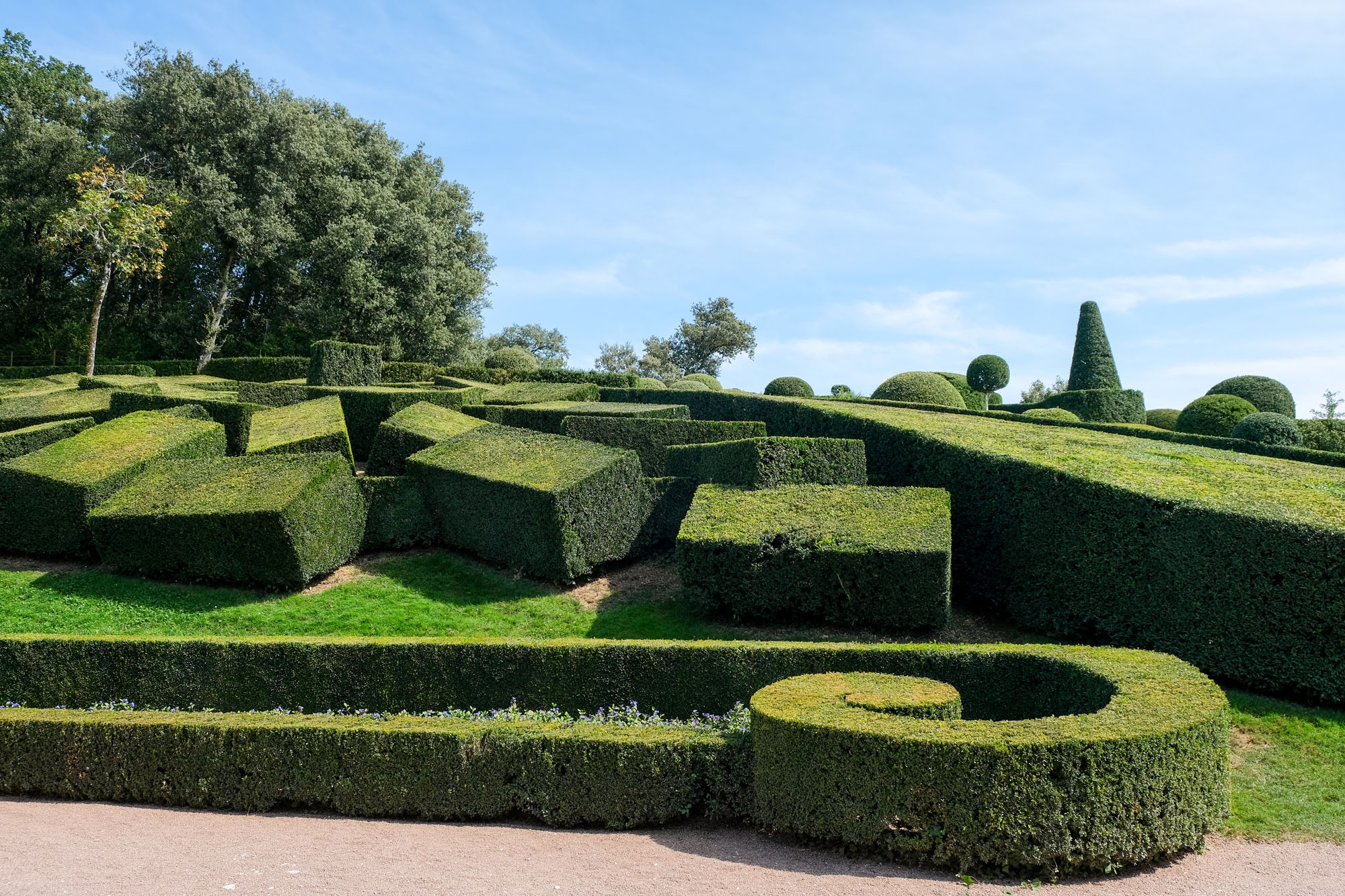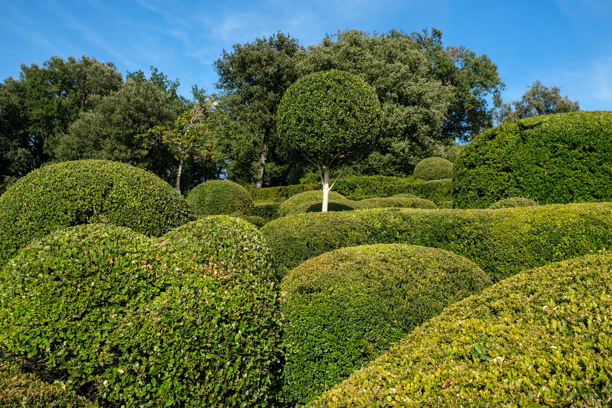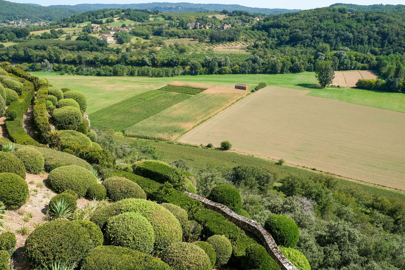 Aménagé sur un éperon rocheux, le parc de 22 hectares domine la vallée de ses hautes falaises. Site classé, les jardins romantiques et pittoresques de Marqueyssac offrent autour d’un château du début du XIXe siècle, plus de 6 kilomètres de promenades ombragées, bordées de 150 000 buis centenaires taillés à la main, et agrémentées de belvédères, rocailles, cascades et théâtres de verdure… Le buis est mis en valeur avec une fantaisie pleine de mouvement tout en rondeur et en taille moutonnante.