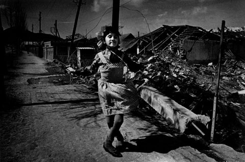 Il y a aussi cette photo de vestiges de guerre à Beyrouth ouest, où dans un immeuble, des enfants regardent le photographe par un trou d’obus béant, le mur sombre est couvert d’impacts de balles, des fils électriques dans un enchevêtrement anarchique tiennent on ne sait comment, malgré un environnement hostile, on sent que la vie est là, on peut même déceler de l’espoir dans le sourire d’un jeune garçon. Antoine Agoudgian capte des instants de nostalgie de peines et de joie, il y a plus souvent des regards graves que des rires, sauf chez cette fillette qui saute à la corde à côté des décombres du tremblement de terre, ou chez les très jeunes orphelines du séisme de 1988 qui serrent leur poupée dans leurs bras et cherchent à jouer avec le photographe.