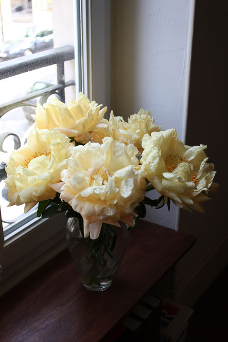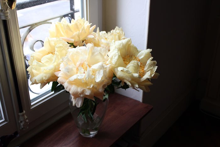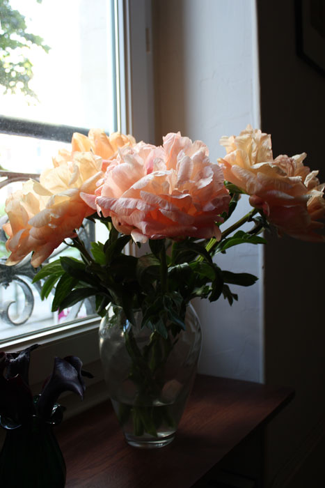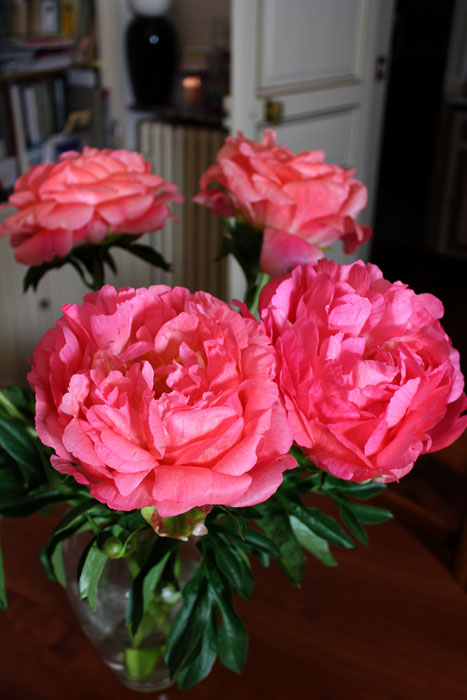 Laurence tenait a apporter des fleurs. Alors le magnifique bouquet de pivoines à voyagé du 14 eme au 12 em arrondissement. Chaque jour elles changeaient de couleur. Une existence courte mais très colorée.